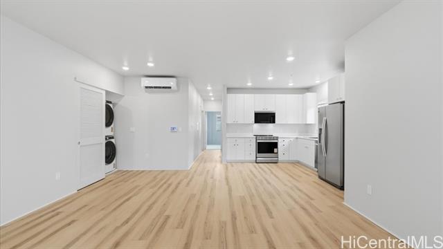 This single ground level 2 bedroom, 2 bath end unit condominium flat consists of 921 square feet of net living area. Step in from the covered entry lanai and enter the open concept living room and kitchen. Past the kitchen is the primary bedroom that includes a walk-in closet, ensuite bathroom with a vanity sink, water closet, step-in shower, and a rear lanai for relaxing and taking in the fresh air. Next door, the secondary bedroom includes a generously sized closet with mirrored sliding doors. Split air conditioning and modern appliances including a range/oven, micro-hood, dishwasher, refrigerator, and washer/dryer allow for ease of living.