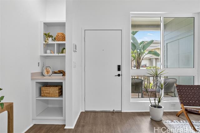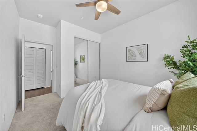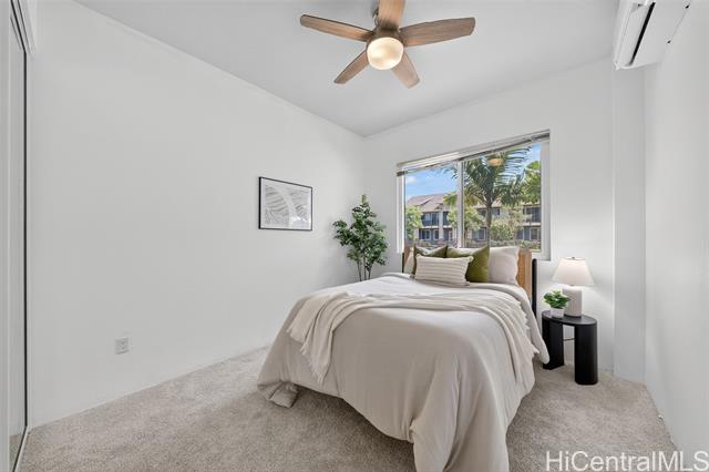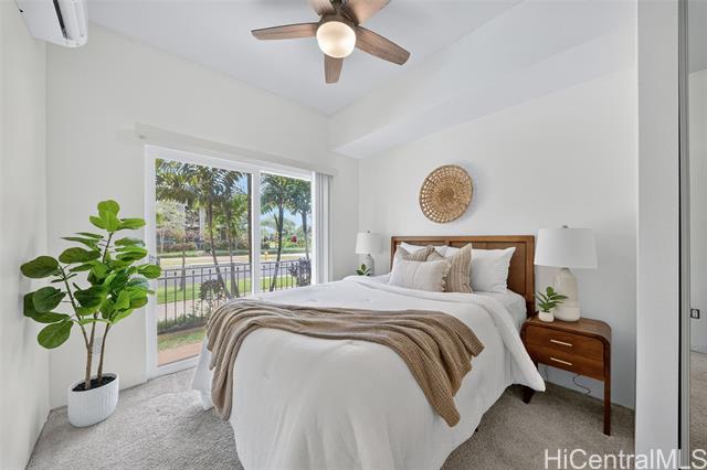 Freshly painted and ready for its next owner, this ground-floor Kohina Phase 2 unit offers 2 bedrooms, 2 full baths, and 2 assigned parking stalls. The open layout features vinyl flooring in the living areas, kitchen, and bathrooms, with carpet in the bedrooms for comfort. Split AC units in the living room and both bedrooms keep the home cool year-round. The primary suite opens to a small, private yard with street access—ideal for relaxing or enjoying a morning coffee. Situated near UH West O‘ahu, Ka Makana Ali‘i, the Kroc Center, freeway on-ramps, and rail and bus stops, the location is as convenient as it gets. A standout feature is the VA loan assumption option at a 3.75% interest rate (Freedom Mortgage, approx. $490,000 balance), providing a rare financing advantage.