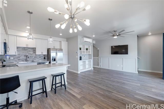***VA ASSUMABLE RATE @3.00%***Welcome to this recently upgraded 2-bedroom, 2.5-bath townhouse built in 2019, offering 1,140 sq ft of modern living. Recent improvements include fresh interior paint, luxury vinyl flooring throughout (no carpet), a custom kitchen backsplash, and updated light fixtures in the kitchen and dining area. Both bathrooms feature spa-inspired tile and stone showers, complemented by a brand-new split A/C system for year-round comfort. The garage transforms into a complete home gym( stays with the property) with Inspire cable machine, bench, dumbbells, plates, curl-z bar, barbell, kettlebells, and sandbag—ideal for any fitness routine. Nestled in Hoopili, enjoy quick access to schools, parks, shopping, dining, and freeway connections. With two parking spaces, contemporary upgrades, and the rare chance to assume a VA loan at just 3%, this home is a true lifestyle and value opportunity.