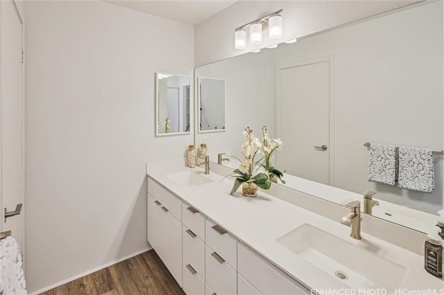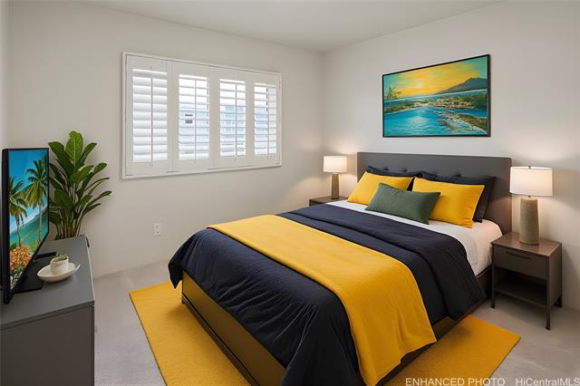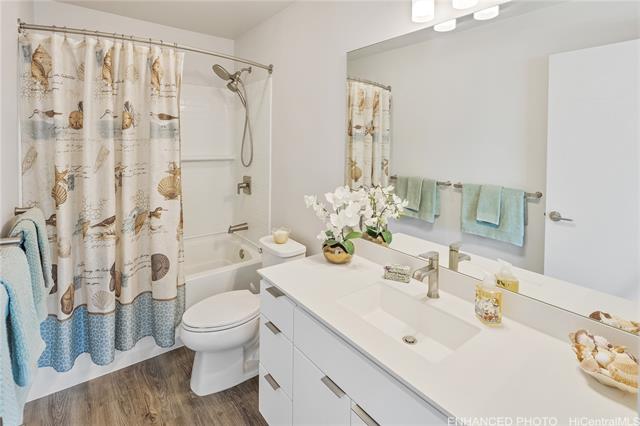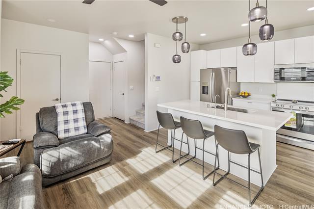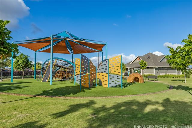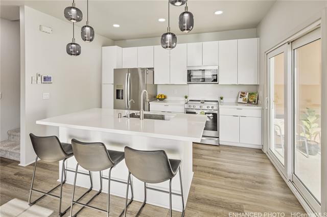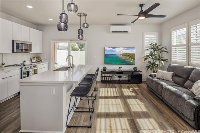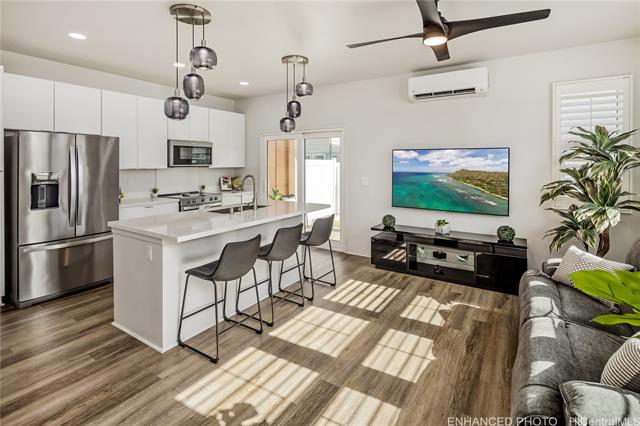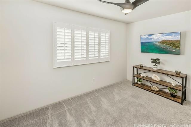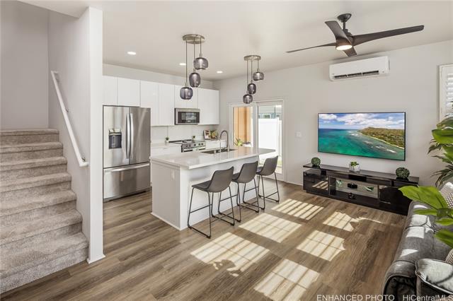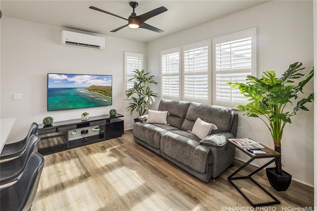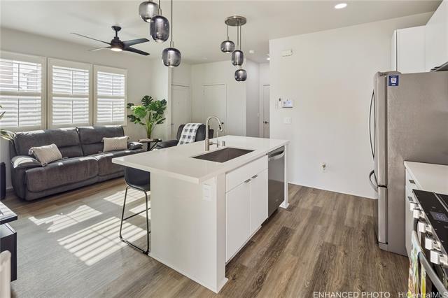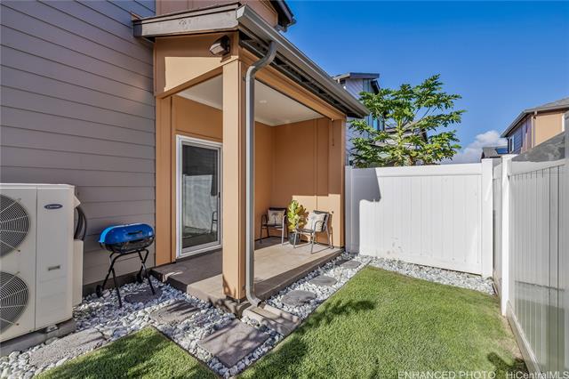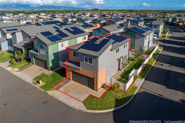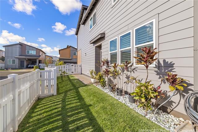 Discover island living in the desirable community of Mamaka at Ho'Opili with an incredible VA assumable loan at 3.75%! This thoughtfully designed 3 bedroom, 2.5 bath single family smart home offers a bright open layout with plantation shutters throughout, creating a timeless elegant look. The contemporary style kitchen features white cabinets with quartz countertops, stainless steel appliances, and plenty of storage. Elegant ceiling fans & chandeliers add a stylish touch. Durable scratch resistant vinyl planks are paired with cozy carpet for comfort. Second floor spacious bedrooms are upgraded with built-in closet cabinets, while a versatile loft/landing area is ideal for a home office or potential extra bedroom. Energy-efficient upgrades include a PV system, Solar water heater & water softening system. Nicely landscaped yard with fruit trees is great for relaxing or entertaining. Pet friendly. Enjoy SoHO Community Center with swimming pool, multiple parks & local businesses. Conveniently close to Kamakana Ali'i Mall, major shopping centers, wide variety of restaurants & famous KoOlina lagoons. Hurry up and bring your best offer! Photos enhanced/Rooms virtually staged.