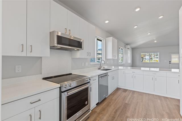 The Kaupapa plan is an open and light design that offers 3 bedrooms, 2 baths, and a total of 1,219 sq. ft. of living space. When you walk in the front door of this new home, you can picture memories being made here. The open vaulted living room flows seamlessly into the dining area, leading to the kitchen and out to your covered lanai. You'll love the modern-style white cabinets and drawers with soft-close capabilities. The kitchen also features a Kohler single-basin vault sink, and a KitchenAid® stainless steel appliance package that includes a range/oven, micro-hood, and dishwasher. The primary bedroom is a gorgeous space that includes a large walk-in closet/safe room and an ensuite bathroom with dual sinks and a step-in shower. Enjoy features such as split ACs in the living area and bedrooms, vinyl plank flooring in the living and kitchen areas, and plush carpeting in the bedrooms. The 2-car attached garage has a utility sink, an automatic garage door opener, and is PV and EV ready. A 10-year Limited Structural Warranty, an Urban Ho'opili Garden with automatic irrigation, and a Home is Connected® smart home system is also included in this home. Home is completed.