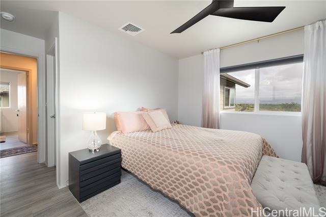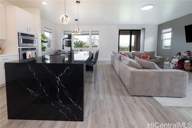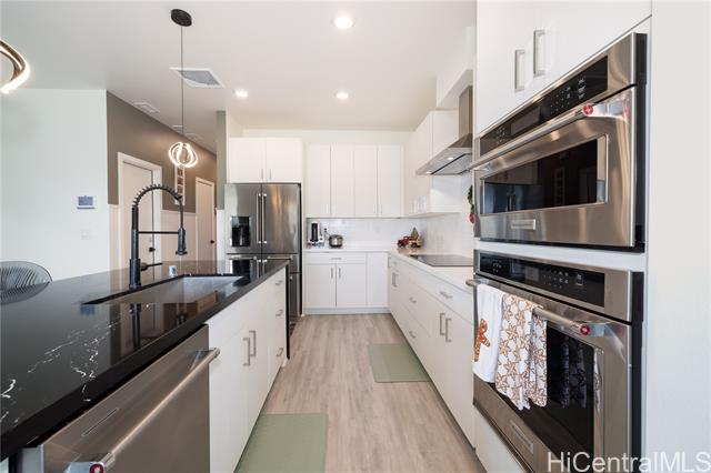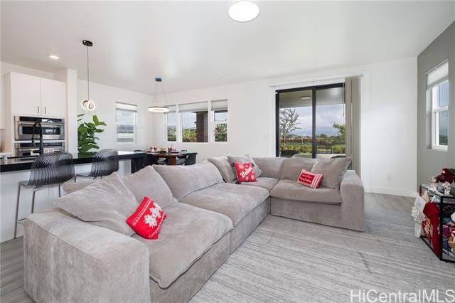 Welcome to The Bluffs at Ho'opili, where modern comfort meets stunning island views. This beautifully maintained 3-year-old home offers 5 bedrooms and 3 full bathrooms, including a highly desirable first-floor bedroom and bath, ideal for guests or multi-generational living. Enjoy exceptional energy efficiency with 20 owned PV panels and two Tesla batteries, powering the home's central air conditioning and everyday comforts. The spacious 2.5-car garage plus a generous driveway providing 3+ additional parking stalls ensures ample room for vehicles, storage, and lifestyle gear. The kitchen is a true showpiece, featuring quartz countertops, a large waterfall island, stainless steel appliances, an induction cooktop, and built-in convection oven and convection microwave - perfect for home chefs. Take in breathtaking Diamond Head, mountain, and water views from this prime homesite, offering a peaceful backdrop day and night. A rare offering in one of Ho'opili's sought-after neighborhoods - don't miss the opportunity to make this exceptional home yours.
