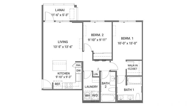 This single story, two bedroom, two bathroom condominium offers 870 square feet of net living area. Upon entering the home, you are welcomed by the kitchen featuring an island, stainless steel appliances, and white soft-close cabinetry. Beyond the kitchen is an open concept living room, perfect for everyday living and entertaining. Just off the living area, the lanai provides relaxing space to enjoy fresh air and the outdoors. Down the hallway, you’ll find the laundry room, secondary bedroom with a mirrored sliding door closet, and bathroom featuring a vanity and shower-tub combination across the way. Additionally, the primary bedroom with a mirrored sliding-door closet, and ensuite bathroom with two vanity sinks and combined bathtub and shower help complete the home. Split air conditioning and modern appliances including a range/oven, micro-hood, dishwasher, refrigerator, and washer/dryer add comfort and convenience for easy living.