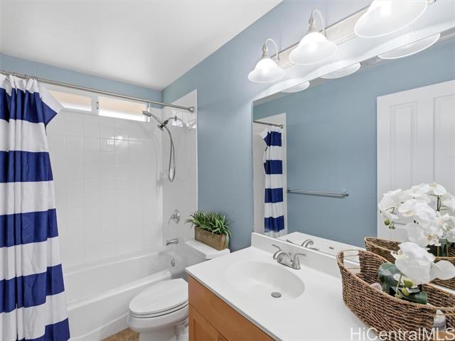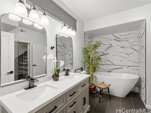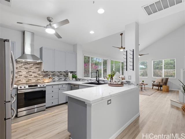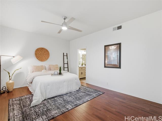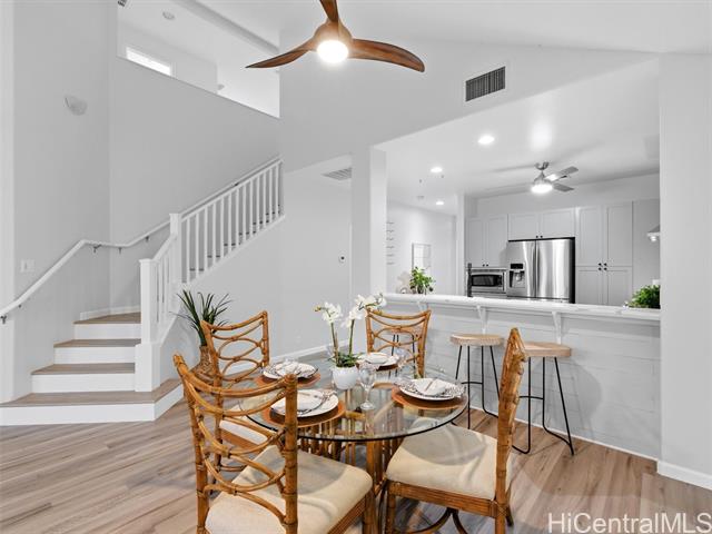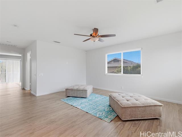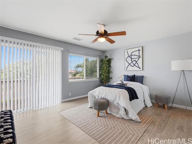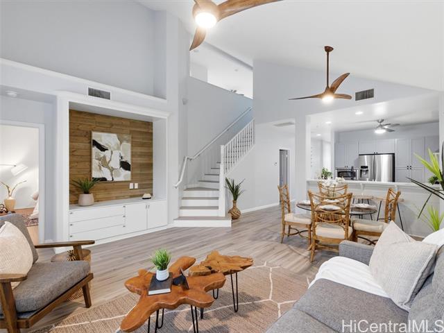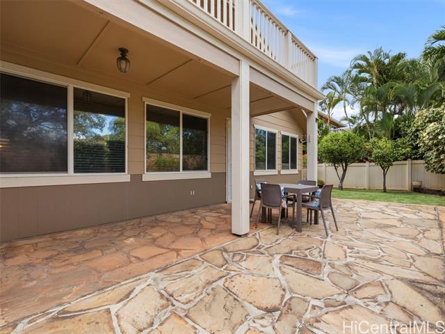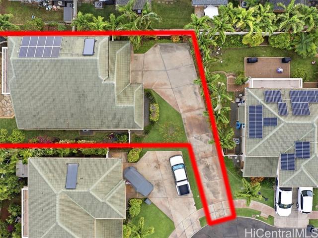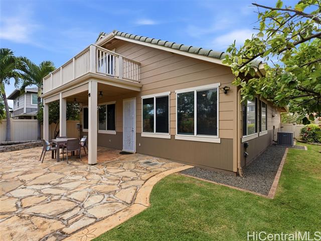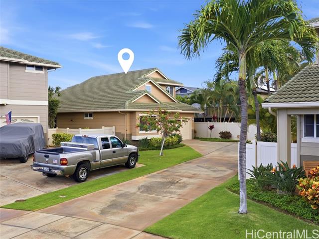 VA ASSUMABLE LOAN of 4.5% to qualified VA buyers. Welcome to elevated island living in the gated community of Hu'elani in Ewa Beach. Situated on a prime corner lot, this pristine, modernly renovated 3-bedroom, 3-bath home offers flexibility and style. Two bedrooms and two full baths are conveniently located on the ground floor, ideal for guests or multigenerational living. Upstairs, a spacious bonus area provides endless possibilities. The contemporary kitchen opens seamlessly to a spacious living area and flows out to a covered lanai and beautifully manicured garden, creating effortless indoor-outdoor living. A rare long driveway provides additional parking and enhanced privacy. Adding even more value are 10 owned solar panels and a solar water heater, helping to significantly reduce monthly electricity costs and improve energy efficiency. Residents enjoy resort-style amenities including a clubhouse, covered BBQ and dining areas, community pool, fitness center, and walkable sidewalks throughout. A safe, welcoming neighborhood where neighbors connect and children play freely.