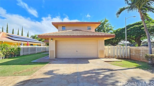 Rare opportunity to own a perimeter lot property w/ a long driveway for additional 3+ parking! Offering over 5,000 sq.ft. of land & located in a cul-de-sac w/ no neighbor on one side, ensuring privacy. Updates include fresh interior & exterior paint, new ceiling fans, security screen door, door stoppers, washer valve, irrigation valves, & newer microwave. It's move-in ready & welcoming your personal touch. This home boasts an open floor plan, hard wood flooring on the upper level, & AC units in all bedrooms. More highlights include indoor washer/dryer, tamper-proof outlets, & an abundance of windows providing natural light. Large front & back yards are designed for low maintenance w/ minimal landscaping, all equipped w/ a sprinkler system. A covered lanai/patio opens up to the green space for outdoor entertaining. Residents of the Villages of Kapolei enjoy access to a community pool, rec center, park, & general maintenance services. This prime location is located near Kapolei Shopping Center, Ka Makana Ali’i, Kapolei Golf Club, dining, medical facilities, Ewa Beach, & all the amenities that Kapolei has to offer. Don’t miss the chance to make this exceptional property your new home!