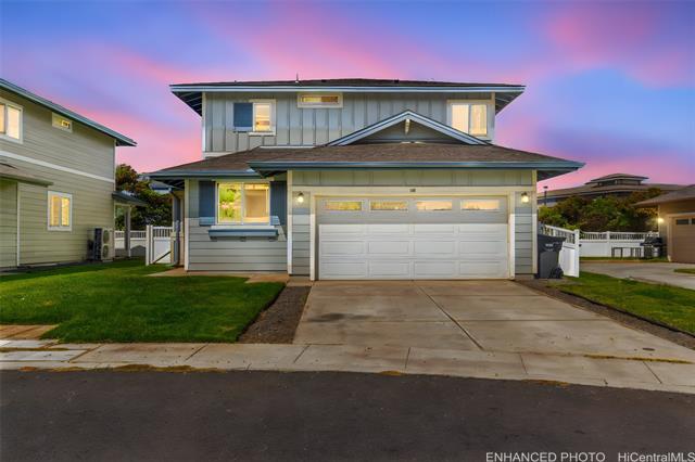 BACK ON MARKET! Enjoy the quiet cul-de-sac living at Kawena at Mehana in Kapolei. This beautifully designed single-family home offers both comfort and convenience with a spacious layout. On the first floor, you'll find a bedroom and full bathroom, perfect for guests or multi-generational living. The second floor features a primary bedroom with an ensuite bathroom, two additional bedrooms, and another full bathroom. The kitchen is a chef's delight, equipped with stainless steel appliances, cherry wood cabinetry, Corian countertops, and luxury vinyl plank (LVP) flooring throughout the first floor. Step outside to your fully fenced backyard—ideal for privacy and outdoor gatherings. The home also includes a two-car garage with additional driveway space for two more vehicles. The Kawena at Mehana community offers an abundance of amenities, including a community pool, basketball courts, a dog park, bike paths, restaurants, shops, a theater, and medical facilities. Located just a short drive from the new Ka Makana Ali‘i Shopping Center, the Kroc Center, and the Ko Olina Disney Resort, this home provides access to everything Kapolei has to offer! One or more photos have been enhanced.