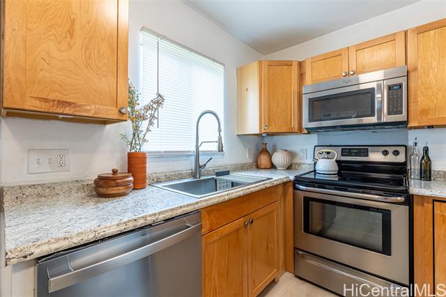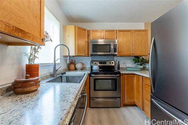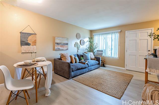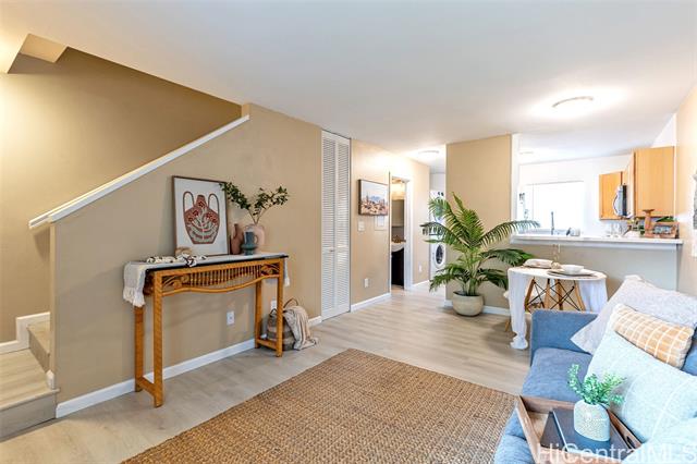 Don't miss out on this beautiful, move-in ready Kapolei home! Enjoy upgrades such as new fresh interior paint, new vinyl wood flooring, quartz kitchen bar top, and more. Kitchen is equipped with a brand new stainless steel refrigerator and dishwasher, plus an in-unit washer and dryer. Stay cool with window AC units in the living room and both bedrooms. Centrally located near schools, Kapolei Commons, Ka Makana Ali‘i, Ko Olina, and more. A short drive to Schofield Barracks and Wheeler Airfield. A great location and an even better value!