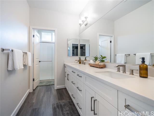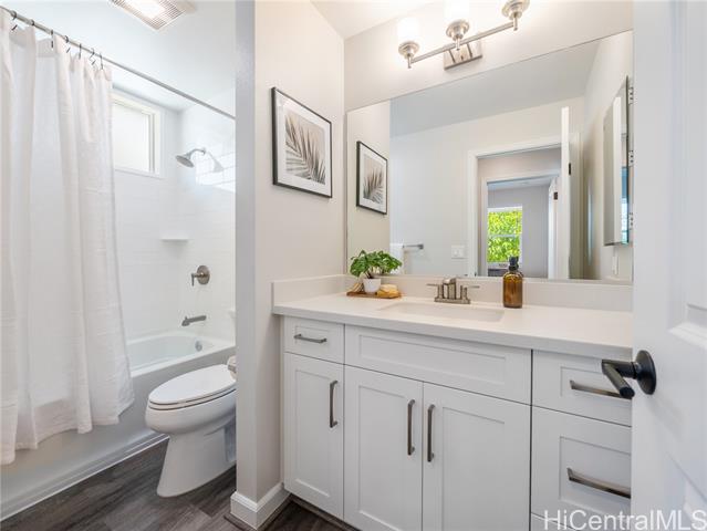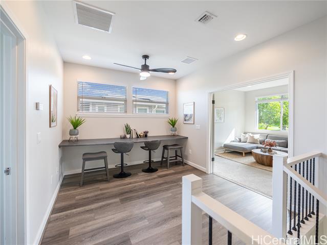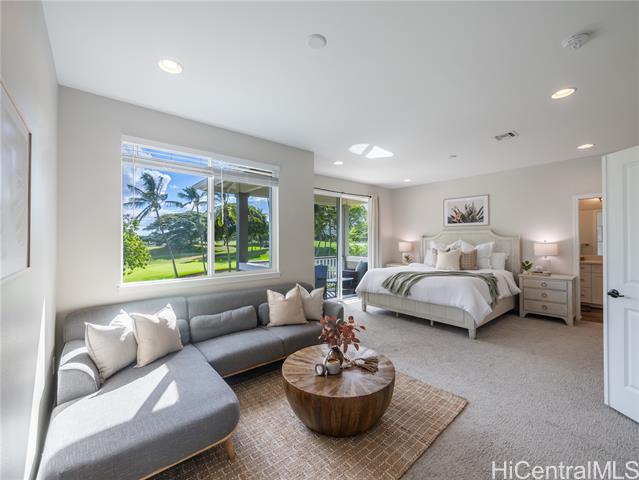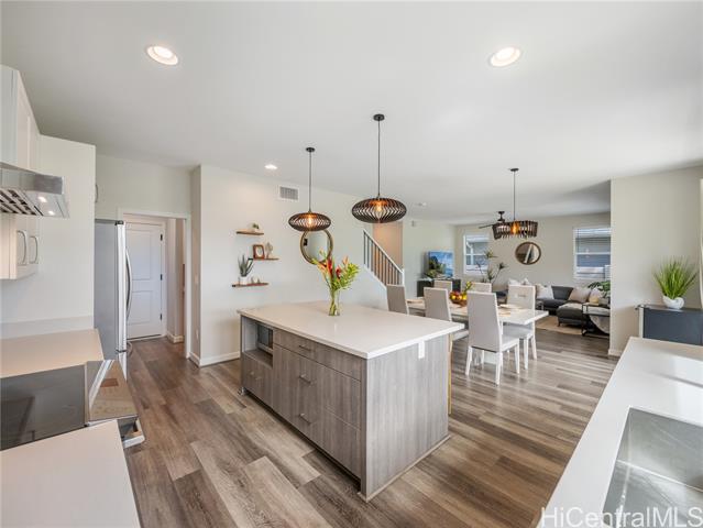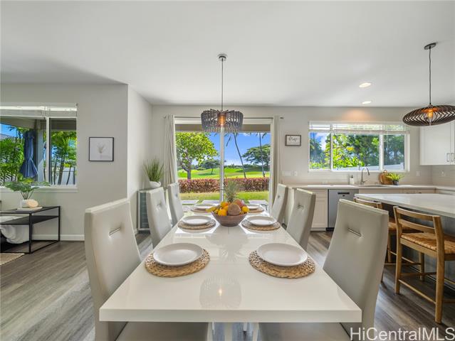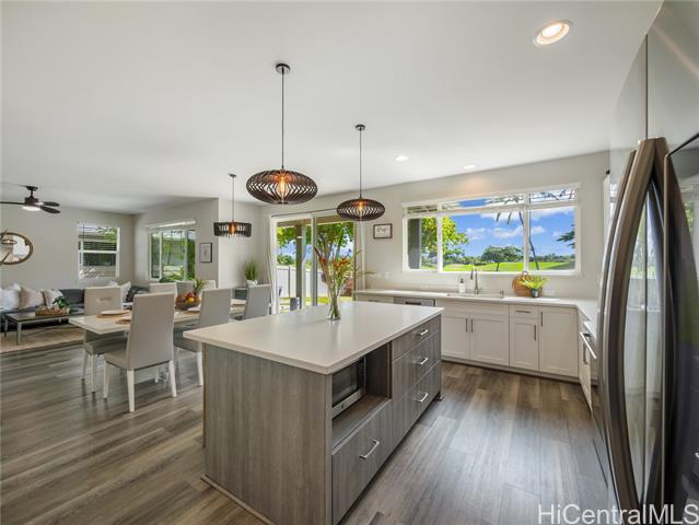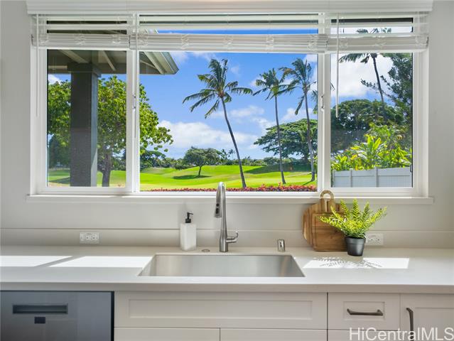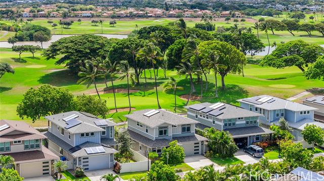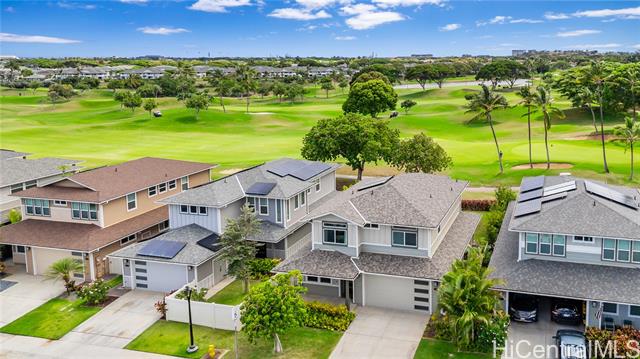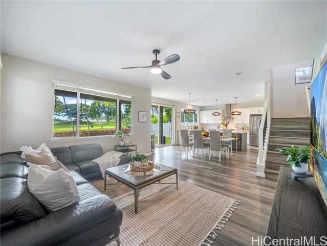 Perfectly situated on Hole 17 of the beautiful Kapolei Golf Course, this 4-bedroom, 3-bath home offers 2,119 sq ft of thoughtfully designed living space in one of Oahu’s most sought-after communities. Step inside to a bright, open layout with a chef’s kitchen featuring a large island, range hood, dishwasher, refrigerator, and wine cooler—ideal for everyday living and entertaining. The primary suite includes a walk-in closet and private ensuite, while the additional bedrooms offer flexible space for guests or a home office. With central AC, in-home laundry, and a fully fenced backyard overlooking the fairway, this home blends comfort, privacy, and scenic beauty. Located in the heart of Kapolei, you're just minutes from shopping, dining, top-rated schools, and world-class beaches—all while enjoying the tranquility of golf course living.