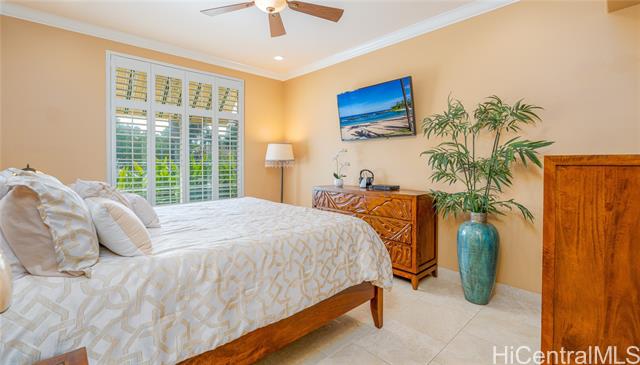 Ocean view 3 Bedroom 2 Bath beautiful ground floor in Kai Lani with marble flooring throughout and a fabulous remodeled kitchen with GE Café appliances. Fully furnished in a chic blend of French antiques and island-style furniture. Pristine condition and never a rental! Gorgeous ocean and sunset views from the lanai, living area, and primary suite. Spacious en suite with walk-in closet, double vanity, soaking tub, and shower. Guest bedroom plus 3rd bedroom with built-in office. Upgrades include A/C (replaced in 2018), plantation shutters, ceiling fans, crown molding, water softener, security system and electric outlet to parking stall. Parking for 2 with garage + stall. Close walk to pool and manager’s office. Kai Lani features a heated pool, whirlpool, grills, and dining area. Live the resort lifestyle with lagoons, restaurants, market, café, golf, tennis, pickleball, spas, and sunsets. Neighbors include Disney’s Aulani, Four Seasons, and Marriott Beach Club. Fees cover fitness classes, gym, tennis, pools, premium cable, internet, water, sewer, landscaping, building maintenance & insurance.