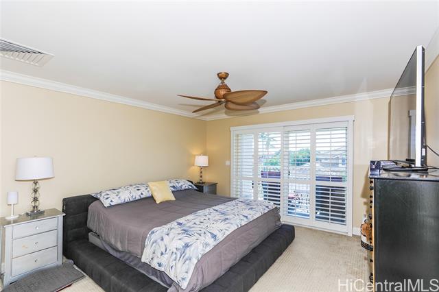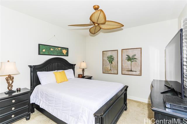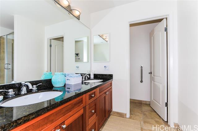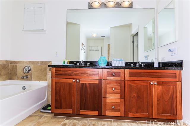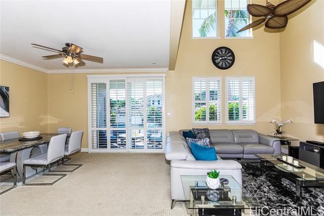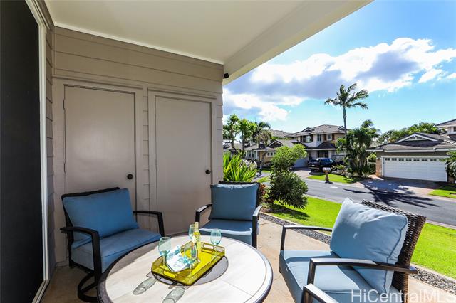 Best-priced 3BR/3BA home, located within the gated Ko Olina Kai Golf Estates community. Ideally located near the open air recreation pavilion, featuring a whirlpool spa & sparkling lagoon pools, covered cabanas w/barbecue grills for an intimate party or picnic. Just a short walk to the beach, golf course, dining, shopping, and world-class Ko Olina Resort amenities. This light-filled, open concept two-story home offers an amazing living room with a high vaulted ceiling which flows into the kitchen w/stainless steel appliances, granite countertops and wood cabinetry. Dining area opens to a private patio overlooking a lush greenbelt—perfect for indoor-outdoor island living. A spacious ground-floor bedroom and full bath offer flexibility, plus a separate laundry room with full-size washer and dryer. Upstairs, the spacious primary suite includes a walk-in shower, soaking tub, double sinks, and private lanai. Plantation shutters throughout and a whole-house water filtration system complete this resort-style residence.