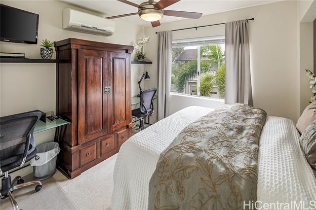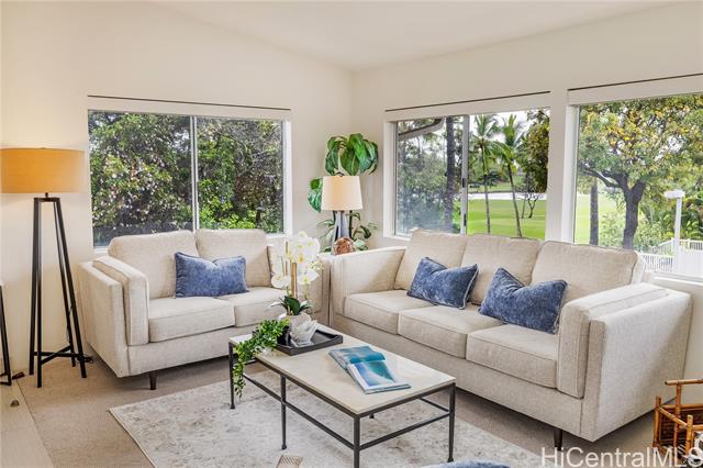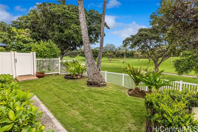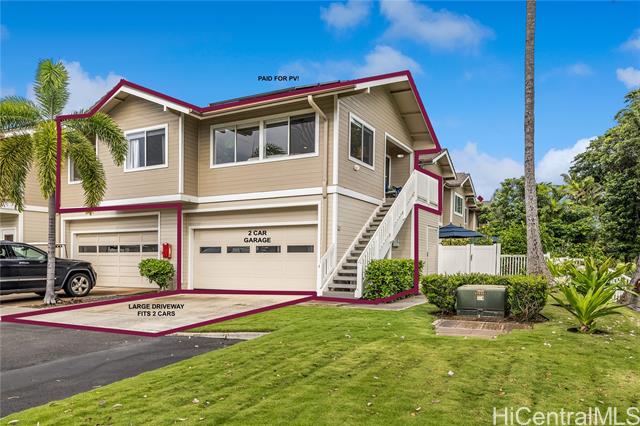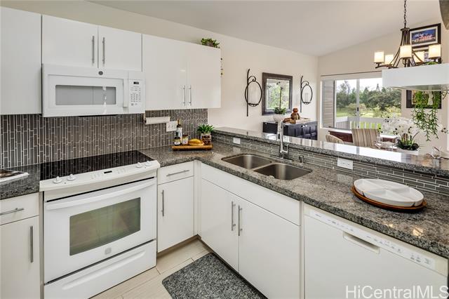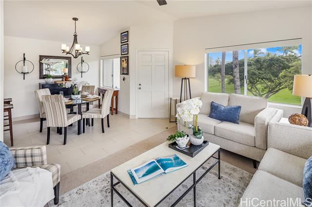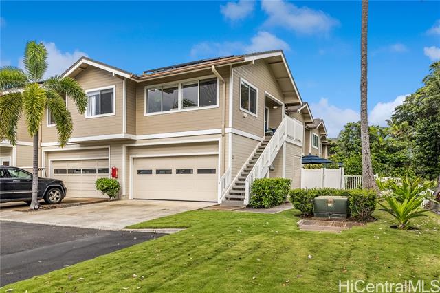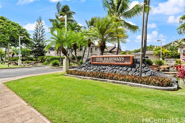 A wonderful golf course–front opportunity in Fairways at Ko Olina, this 2-bedroom, 2-bath residence stands apart for its position, privacy, and overall condition—an immediate advantage for buyers comparing inventory. Offered fully furnished and move-in ready, the home features an updated kitchen and bathrooms, upgraded flooring, remote-controlled blinds, split AC, a water softener, and fully owned PV panels to help reduce electricity costs. Vaulted ceilings and plenty of windows bring in natural light, while open golf course views create a calm, comfortable living environment. Positioned on a quiet cul-de-sac off the main drive, it offers a more private setting within the community. The residence sits above its own newly epoxy-coated 2-car garage and includes additional driveway parking. This residence includes membership to the Ko Olina Beach & Sports Club, providing access to beach parking, fitness facilities, tennis and pickleball courts, and additional resort amenities. Enjoy close proximity to the Ko Olina Golf Club, dining, luxury spas, and the resort’s iconic beach lagoons. OPEN HOUSE SUNDAY APRIL 19th 1-4PM