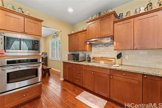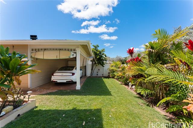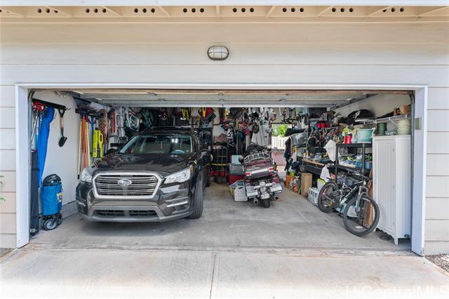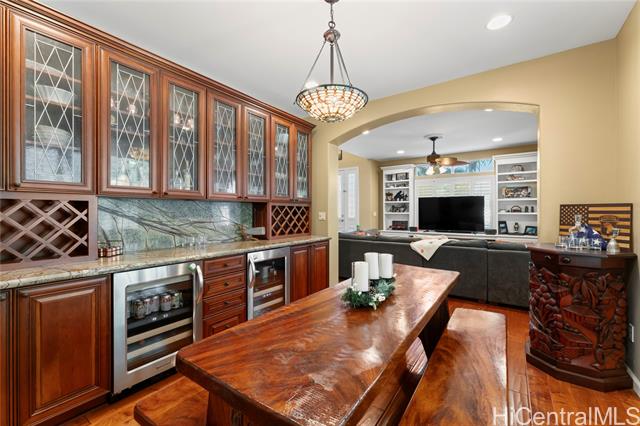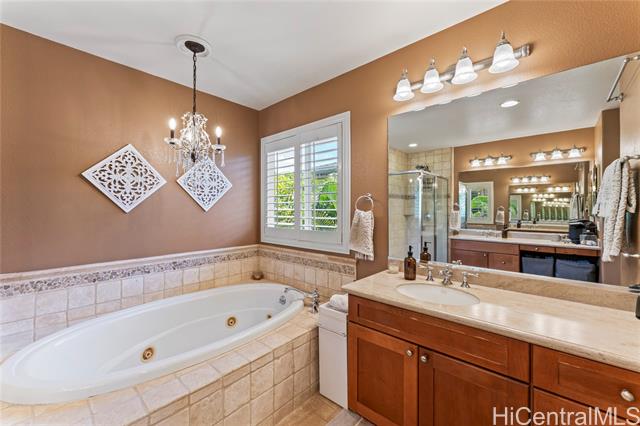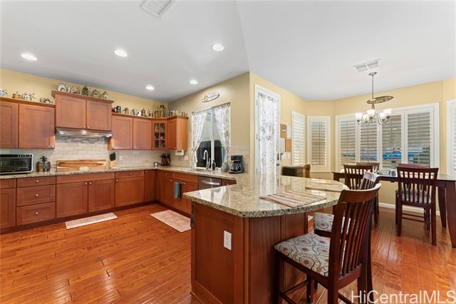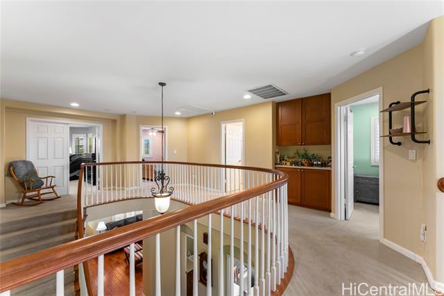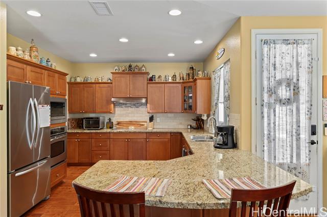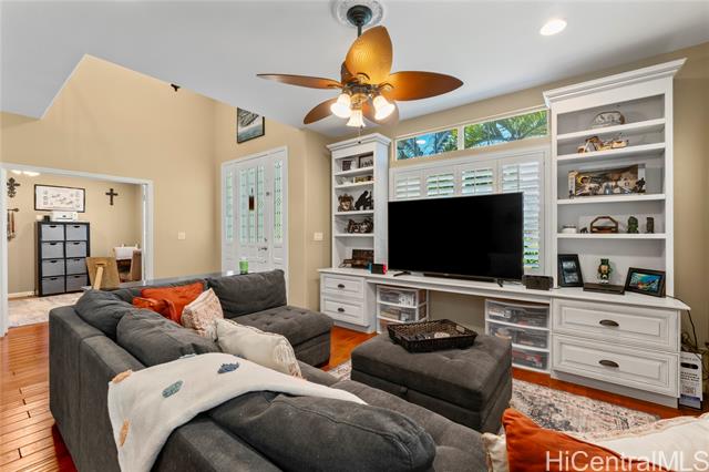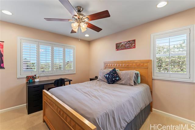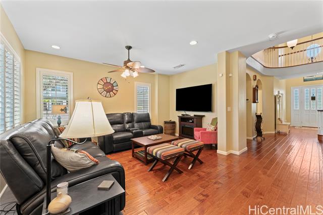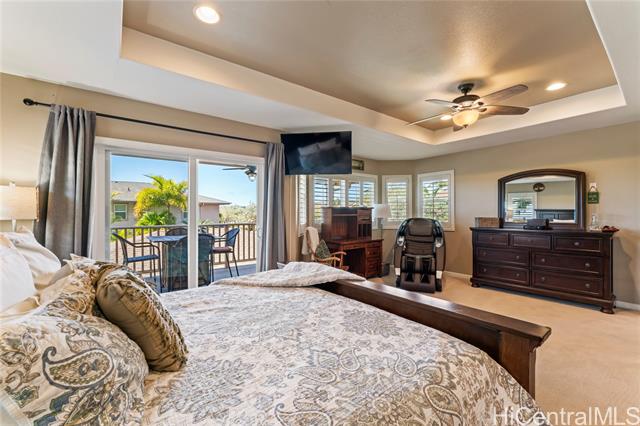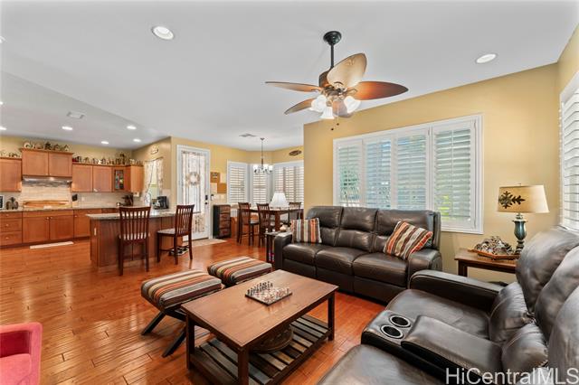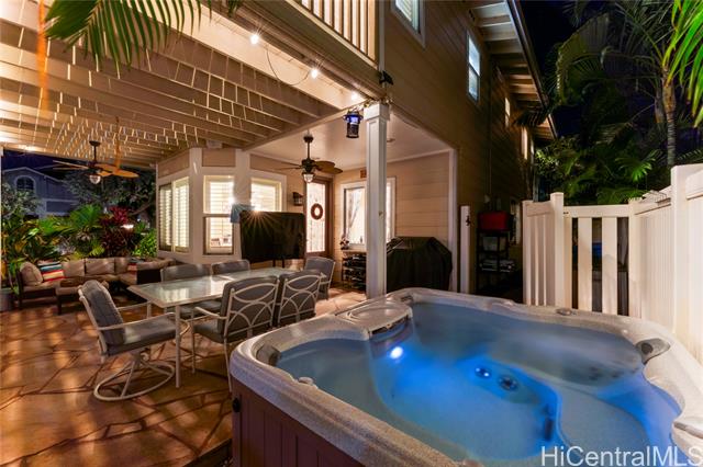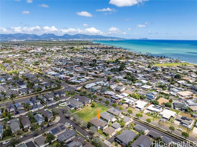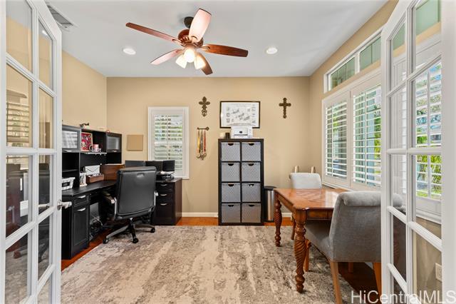 2.8% VA rate! This meticulously maintained corner-lot home features 4 bedrooms and a bonus office on the 1st floor. 43 owned solar panels with transferable 1:1 net metering, a new roof (2024), and a new A/C unit (2020). The property fronts a large shared green space with no houses directly in front or on one side. Interior highlights include hand-scraped bamboo floors, plantation shutters throughout, and dual living areas designed, so everyone has their own space. The gourmet kitchen has granite counter tops, a large pantry and custom cabinetry with dual beverage refrigerators. The primary suite features dual closets and a large private lanai with ocean views, while front bedrooms view Diamond Head. Enjoy built-in Bose speakers, a laundry room, and ceiling fans in nearly every room. Outdoor amenities include a fenced yard, hot tub, dog run and upgraded stone flooring on the lanais and porch. Systems include a solar water heater, new solar inverter (2024), solar fans, and a multi-zone sprinkler. A 2-car garage plus a covered carport provides 3rd parking. Proximity to schools, the beach, and the community center. Drive times:JBPHH (25-40 min), Schofield (25-35 min), HNL (25-40 min).