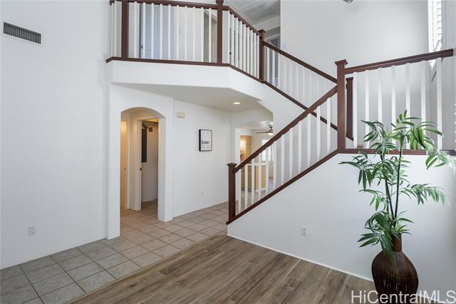 Ocean Pointe: EXCEPTIONALLY well maintained home ready to move in! Most preferred 4 bedroom model with a BEDROOM & BATH ON FIRST LEVEL! Enter the formal living area with dramatic 2-story-height ceilings, wide open kitchen concept with functional in-seating island, dining area, tv/rec area! 3 bedroom / 2 baths upstairs, large walk in closet! Plantation window shutter upgrade throughout the home! Covered lanai area in back, formal plantation-style porch in front! Fully enclosed generous yard area for afternoon play, gardening, pet romp! AND do you need more parking? Extra open space ready for that 3rd car parking! Quiet neighborhood in well-desired area of Ocean Point. Welcome HOME! Ocean Pointe Master CA dues: $62/mo Ke Aina Kai Sub- CA dues $54/mo