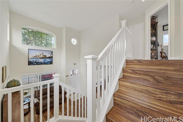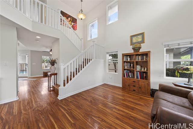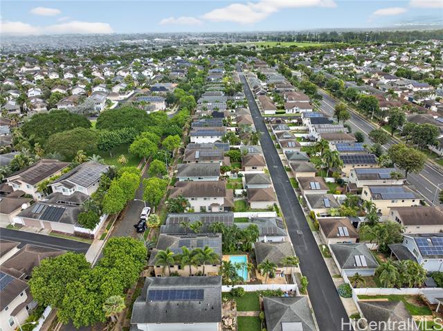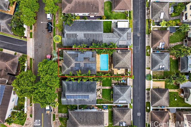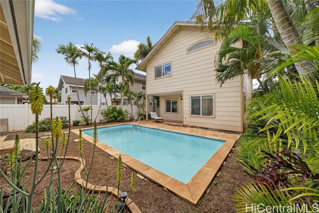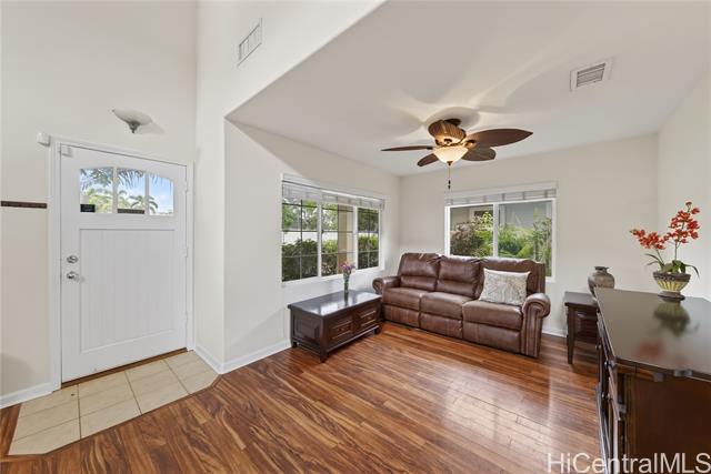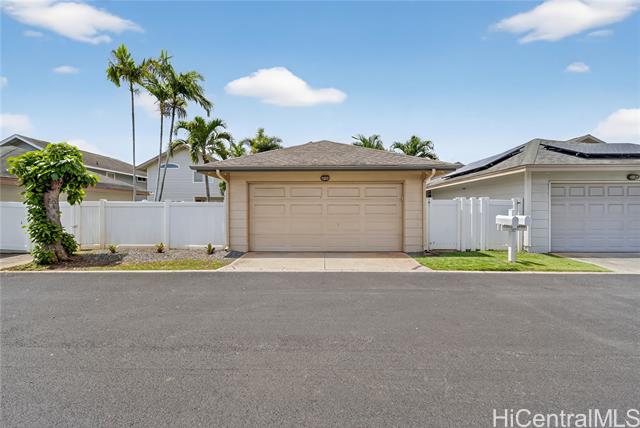 Welcome home to Ke Noho Kai in Ocean Pointe — one of Ewa Beach's most sought-after communities. This well-maintained 3-bed, 2.5-bath home delivers smart, comfortable living with the kind of extras that make a real difference day to day. Inside, vaulted ceilings open up the main living area with natural light throughout. Hardwood and ceramic tile flooring run through the home, leading into a kitchen with modern appliances and solid counter space. The layout flows naturally — easy to live in, easy to entertain in. Out back, a fully fenced private courtyard features a gunite pool surrounded by lush tropical landscaping. It's the kind of backyard you actually want to spend time in. Energy costs? Handled. A 31-panel owned PV solar system and central AC keep this home efficient and comfortable year-round. You also get a 2-car garage plus an extended driveway — extra parking that's hard to find in this neighborhood. Location puts you minutes from the Wai Kai waterfront, Ka Makana Ali'i for shopping and dining, and some of West Oahu's best beaches. This is a lot of home for Ocean Pointe. Don't sleep on it.
