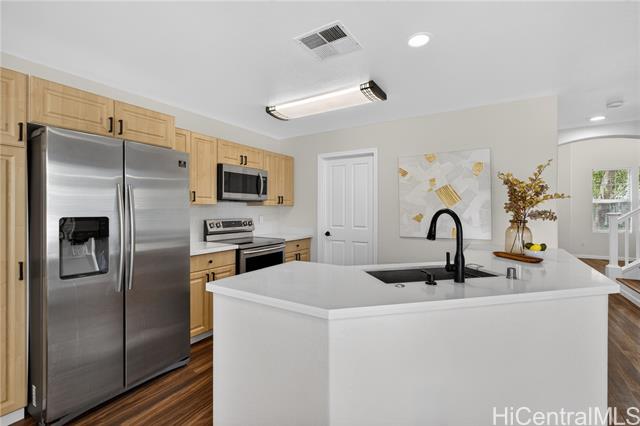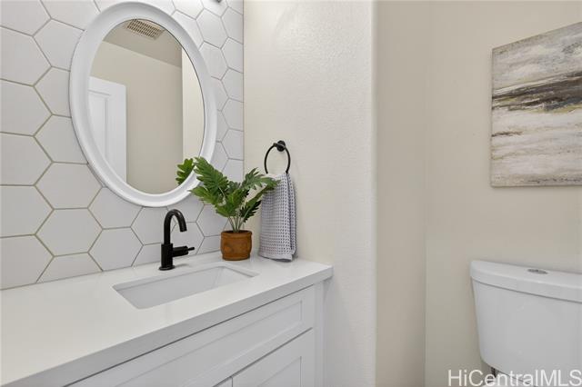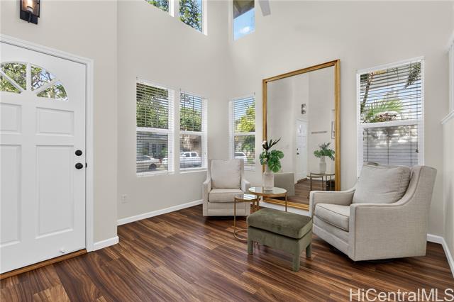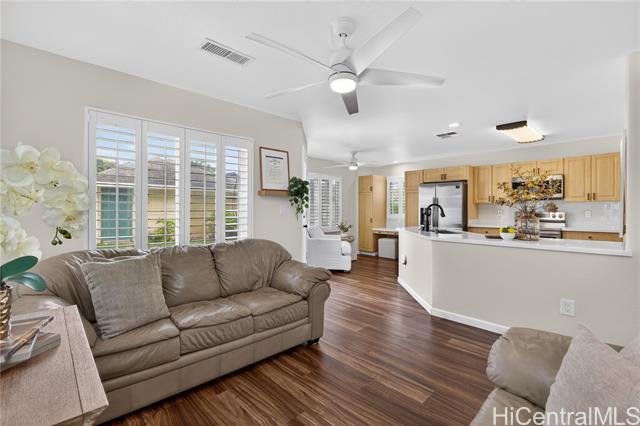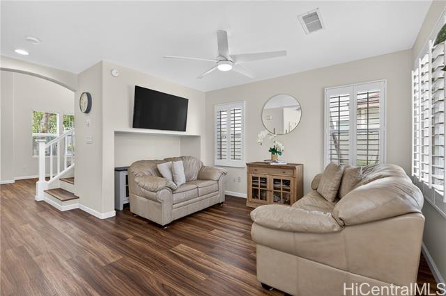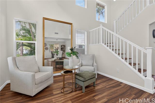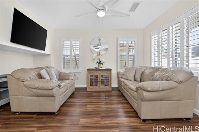 Welcome home to this beautifully updated 3-bedroom, 2.5-bath single-family residence in the sought-after Ocean Pointe community. The first floor offers two separate living areas, providing flexibility for relaxing or entertaining. Luxury vinyl flooring runs throughout the home, complemented by tile in the bathrooms. The kitchen is equipped with all major appliances, a custom backsplash, and a convenient built-in workspace—perfect for work or school from home. The spacious primary suite features a walk-in closet and dual-sink vanity for added comfort. Step outside to a private backyard with a grassy area, ideal for gatherings. Conveniently located near parks, beaches, shopping, and just minutes from Ka Makana Ali‘i. VA Assumable at a 2.625% rate, monthly $3,744.34 and approximate balance of $724,481.44.