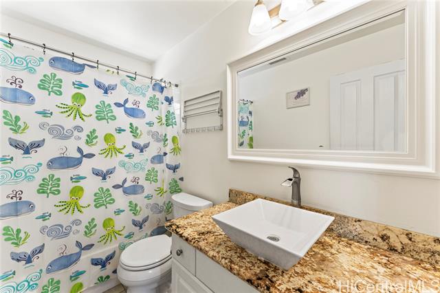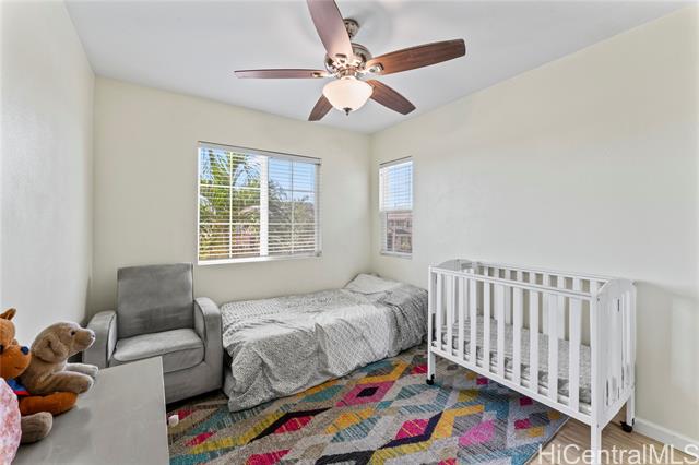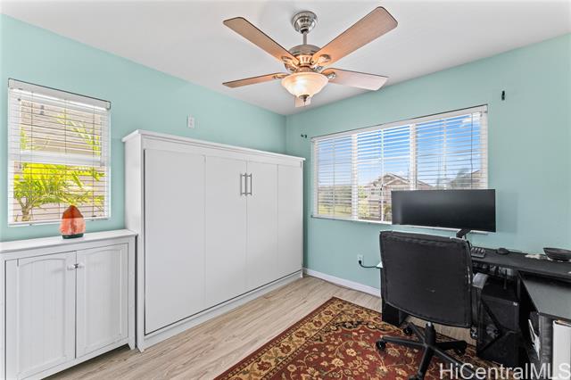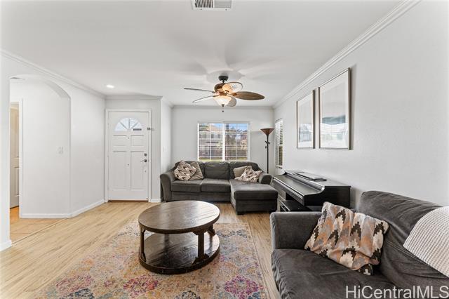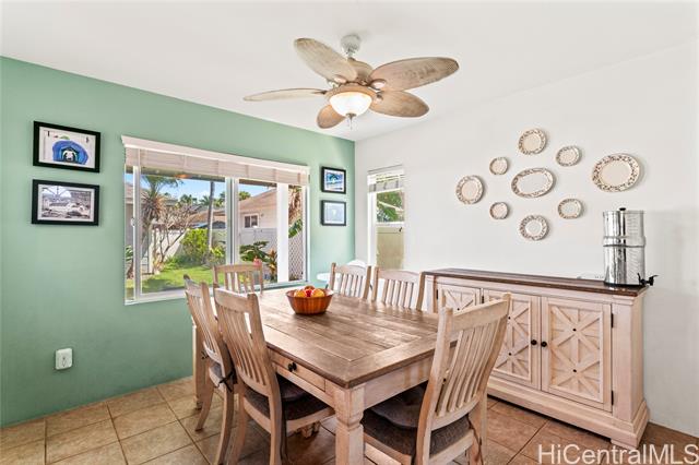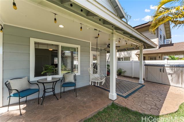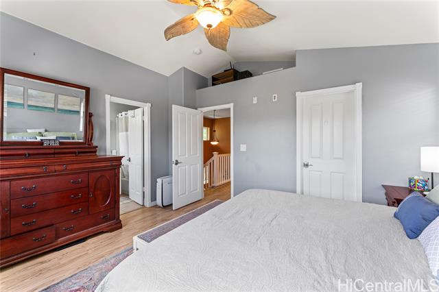 Enjoy the benefits of 16 owned solar panels and central air conditioning, helping to keep energy costs down while maintaining year-round comfort. The kitchen is designed for both function and style, featuring wood cabinets, stainless steel appliances, and huge pantry for your Costco haul. Dining area located just off the kitchen creates a flow for everyday living and gatherings. Home also features a water softener and filtration system. VA assumable loan with Freedom Mortgage, 2.25% interest rate, $2986 monthly payment, approximately $590,000 remaining balance. (Veteran with COE only) Step outside to a covered lanai, perfect for relaxing or hosting get-togethers while enjoying your landscaped backyard leading to your two car garage. Inside, vinyl plank flooring runs throughout the home. Spacious primary bedroom features a vaulted ceiling, large walk-in closet, and views of the landscaped yard, creating a peaceful retreat. Two additional bedrooms upstairs, one of which includes a full-size Murphy bed and closet organizer, offering flexible space for guests, or home office. *School zone obtained using Hawai'i DOE school finder website, Buyer to verify.