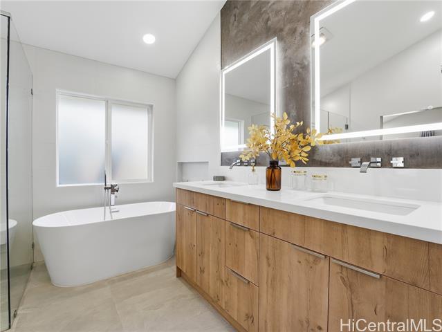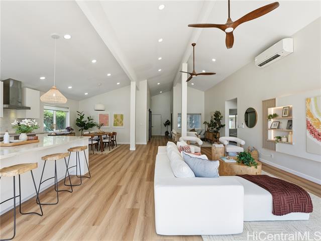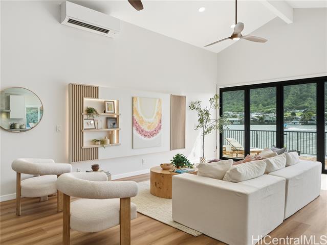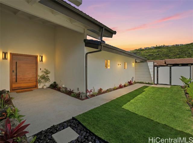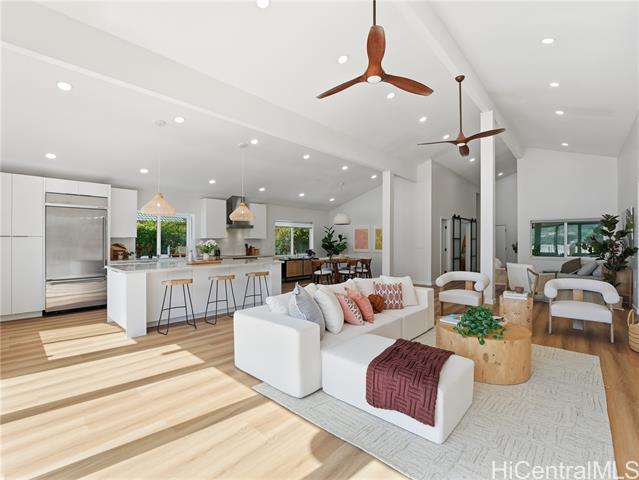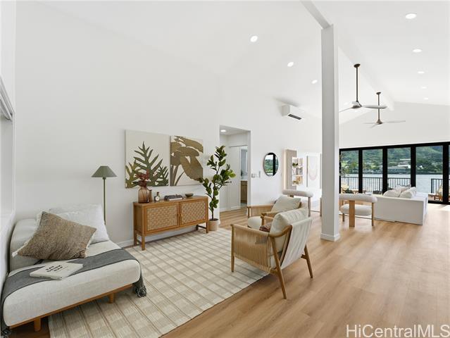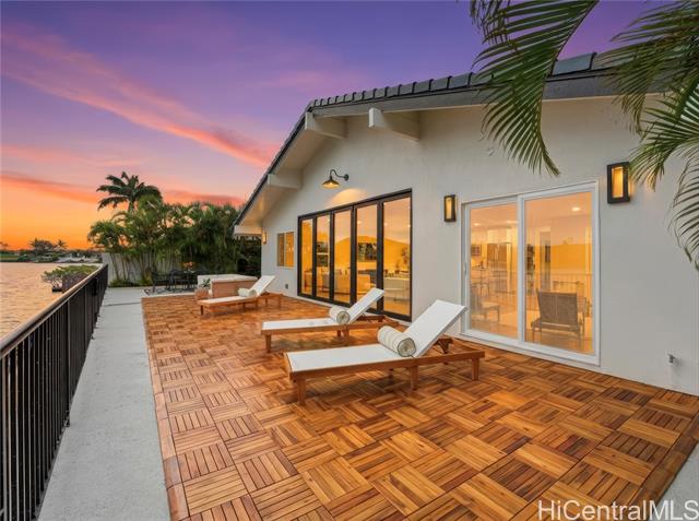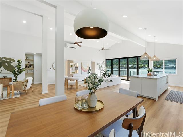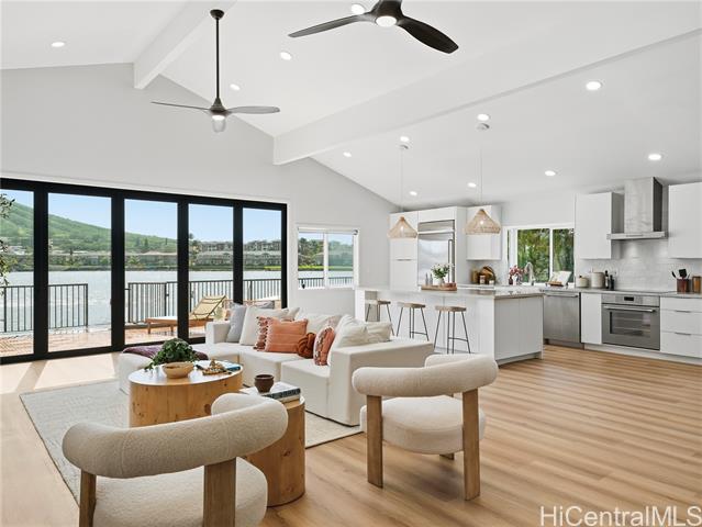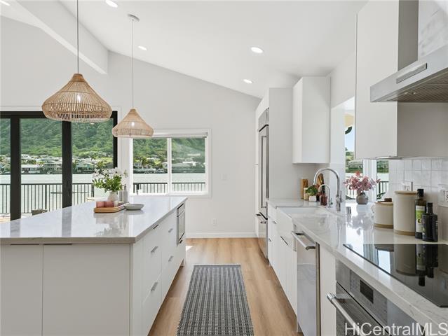 Where modern design meets the rhythm of waterfront life in Hawai?i Kai. This thoughtfully reimagined 4-bedroom, 3-bath residence offers over 2,000 SqFt of open living space designed to inspire. Vaulted ceilings soar above wide-plank floors as natural light pours through expansive glass, creating an immediate sense of warmth and refined sophistication. Every finish reflects intention, and every detail enhances daily living. At the heart of the home, a statement kitchen captivates with waterfall quartz, bespoke cabinetry, and premium appliances, framed by sweeping mauka-to-makai views. Expansive Western Systems sliders fully retract, unveiling a marina-front lanai designed for sunset gatherings and tranquil waterfront mornings. Two private primary suites offer spa-caliber baths adorned with curated tile and modern fixtures, each with direct outdoor access for a seamless retreat experience. Thoughtful system upgrades provide modern peace of mind, while lush landscaping and dock-ready frontage invite the ultimate marina lifestyle. Near world-class hiking at Koko Head and the finest amenities of Oahu, this residence embodies waterfront living elevated to art.