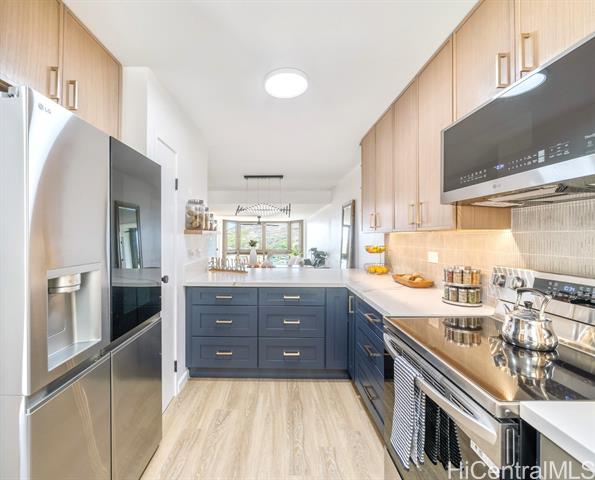 NEW LISTING - This RARELY available 2Bed/1.5Bath/2 parking has been FULLY RENOVATED!!! This home features an open floorplan, designer kitchen, new appliances, custom cabinets, quartz counter tops, beautiful backsplash, luxury vinyl flooring, resort like bathroom, wine cooler, rain shower, ample storage, large island, LED lighting, large undermount kitchen sink, new full size washer/dryer, accent walls, chandelier, cool breezes, AMAZING ocean/marina views, wet bar, ceiling fans, & much more. Mauna Luan is highly desirable and boasts resort like amenities including two saltwater swimming pools, water slide, fitness center, security, BBQ areas, multiple recreation rooms, hot tubs, lush landscaping, guest parking, pet friendly (verify), & is conveniently located near Costco, parks, schools, beaches, bus stops, shopping, restaurants, and much more…A MUST SEE!!