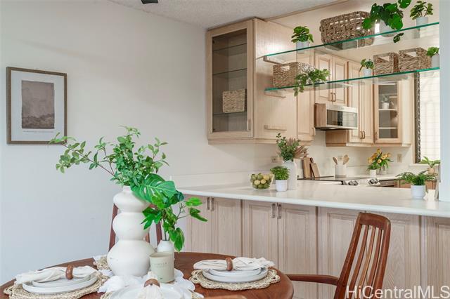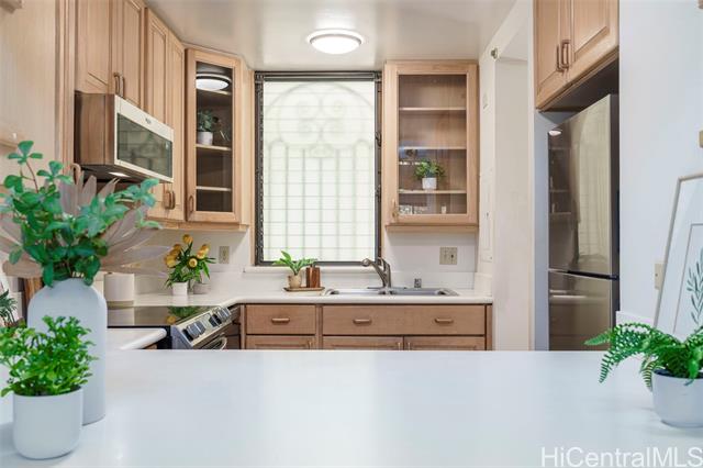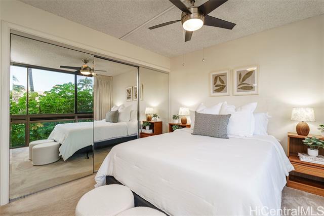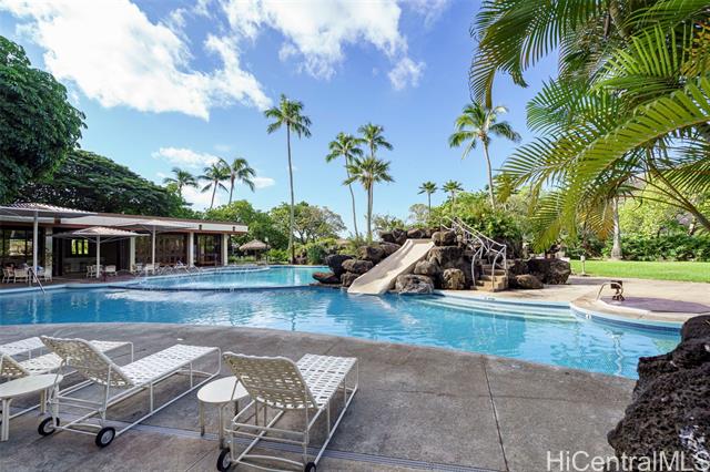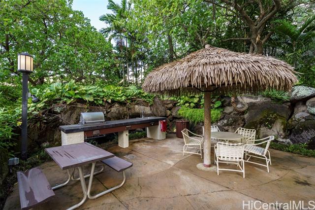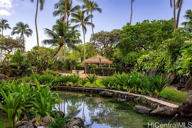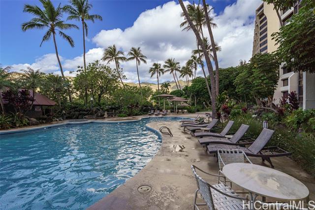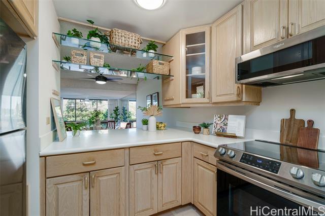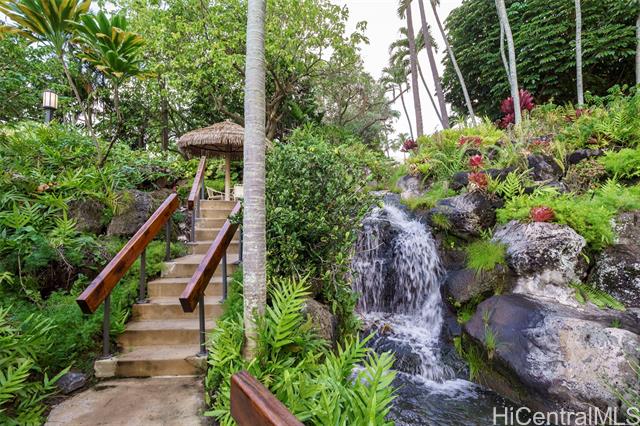 RESORT STYLE LIVING! You'll love coming home to this beautifully remodeled condo at the Mauna Luan. As you step into the living room, you're greeted by beautiful tree-top and mountain views which create a peaceful retreat. The kitchen features solid oak cabinets, stainless steel appliances, marble floors, open views to the living room and an extra wide counter extending through to the dining room. There's also extra storage in the custom cabinets under the counter. Sliding upper plantation shutters separate the living room and bedroom allowing cool breezes to flow through the apartment and create an expansive open space when fully open. This floor plan in the "F" stack is preferred as the bedroom faces the lush tropical landscaping rather than the exterior hallway. What sets Mauna Luan apart from other complexes are the amazing resort style amenities along with the lush tropical landscaping and waterfalls. Multiple pools, spas, picnic areas with gas BBQ grills, party areas with full kitchens, a gym and a handball court are but some of the amenities to enjoy. Full-time security guards, secured storage, two assigned parking stalls and a great location make this condo a great value!