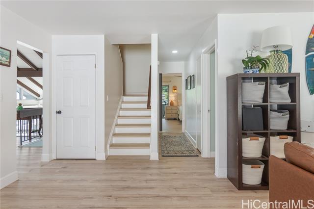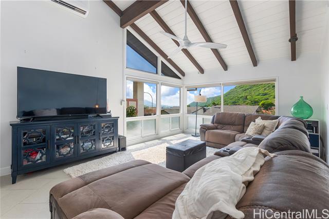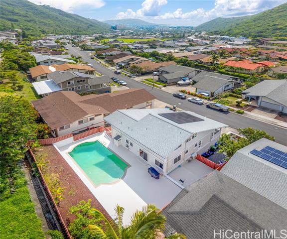 Nestled in one of East Honolulu’s coveted neighborhoods, Upper Hahaione Valley, this beautifully maintained home offers 2,100+ square feet of comfortable living space in a highly desirable school district. Thoughtfully improved over the past five years, upgrades include the installation of PV panels with battery storage, split AC units in every bedroom and the living area, bathroom updates, new luxury vinyl plank flooring, and a 5-year-old roof for added peace of mind. Designed to embrace natural light and stunning surroundings, the home features a welcoming entry with just a few steps up to the main living room, where picture windows frame ocean, mountain, and city views. The kitchen and primary en-suite bedroom are conveniently located on this level, while three additional bedrooms are situated upstairs. Outdoor living is just as inviting, with a swimming pool and a spacious deck. The lanai from the primary bedroom is perfectly positioned to capture the panoramic scenery. Ideally located just minutes from ocean activities, hiking trails, beaches, shopping centers including Costco, eateries; this exceptional property offers the best of island living. Floor plan available.