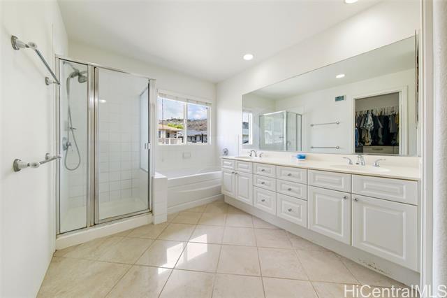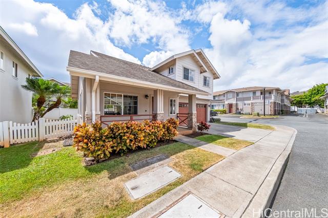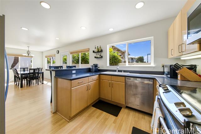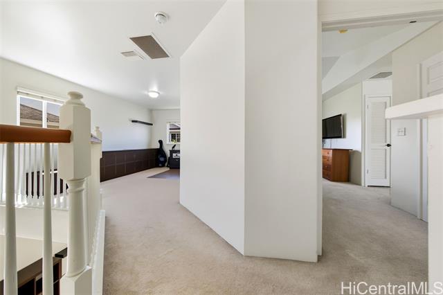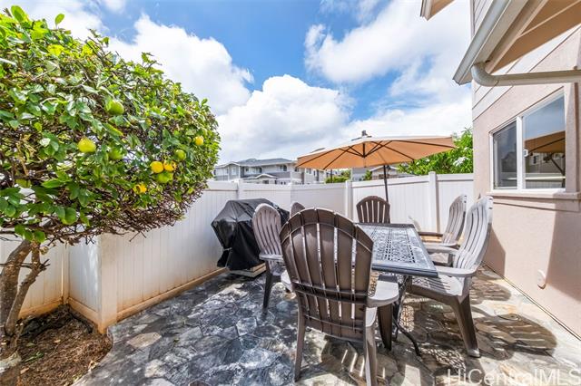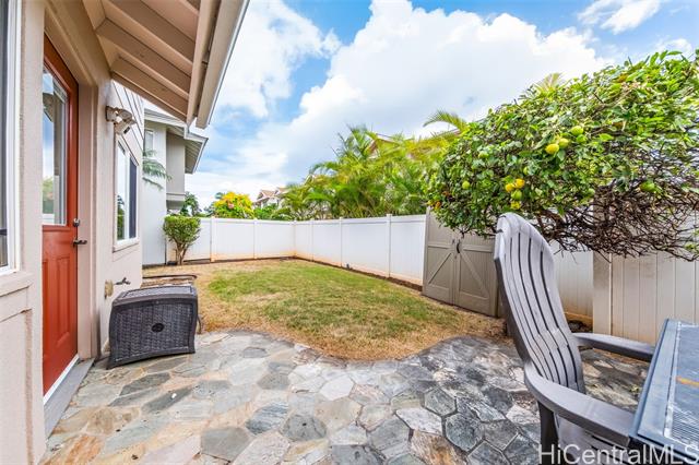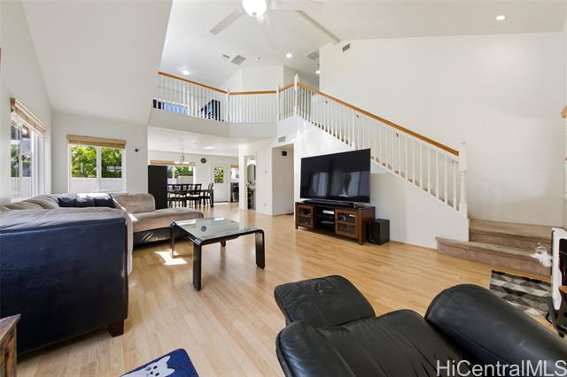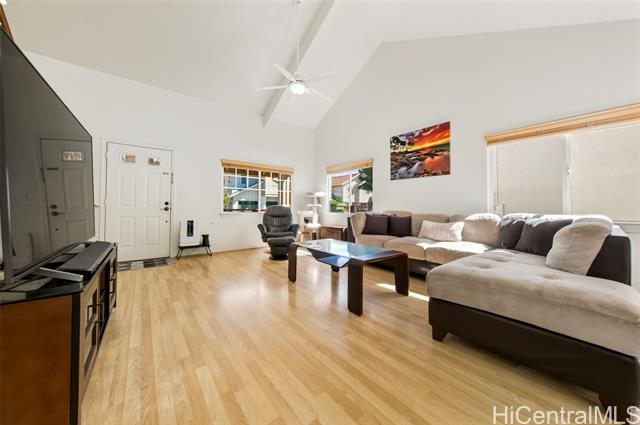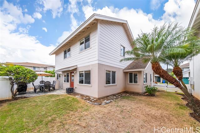 Rarely available single-family home in Kalamaku’u in Kalama Valley, Hawaii Kai. Great floor plan with living room, dining area, kitchen and half bath downstairs. Vaulted ceilings in living room. Three bedrooms and two full baths upstairs. Primary bedroom suite with walk-in closet, bathtub and shower and golf course views. Two car garage with driveway parking. Lots of natural light throughout. Central AC. Upstairs 4th bedroom option offers open multi-purpose living space currently used as home office with golf course views. Corner lot with fully fenced in yard with grass and mature citrus and pomegranate trees. Stone tiled lanai for outdoor living. Community park with playground nearby. Visitor parking available. Maintenance fee includes water, sewer, common area maintenance and Association master insurance policy. Needs a little TLC but ready for new owners.