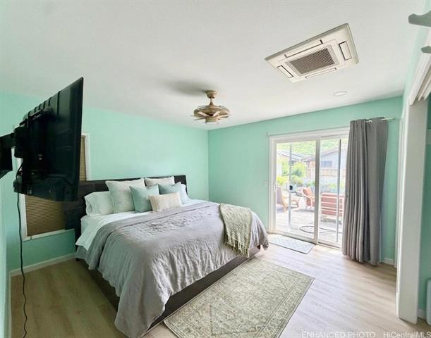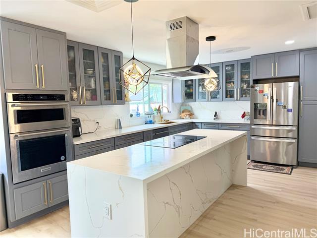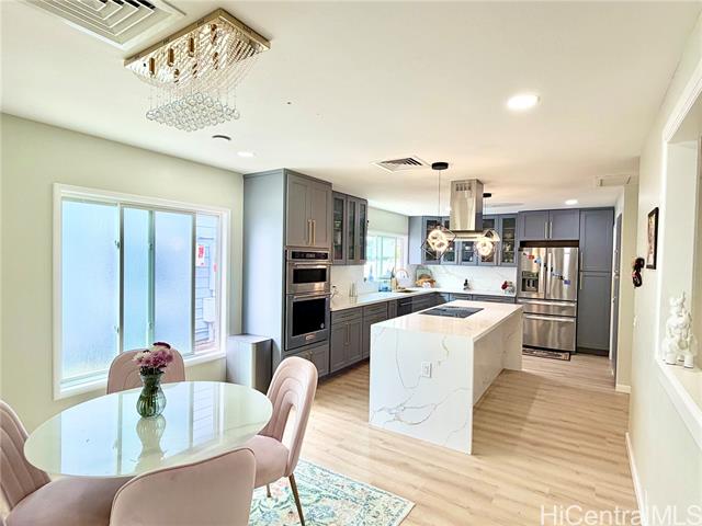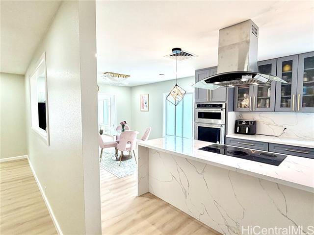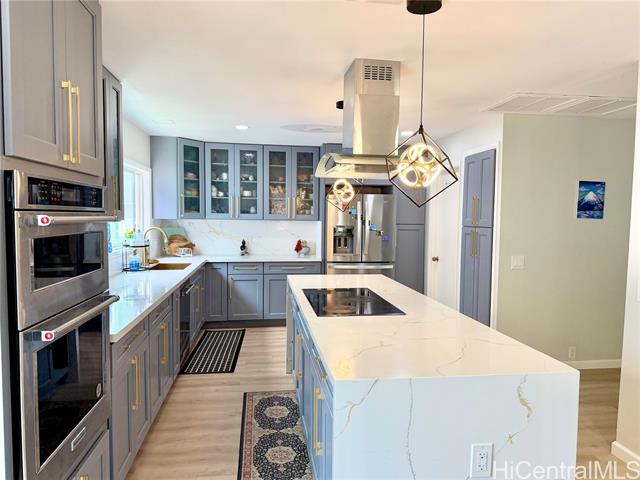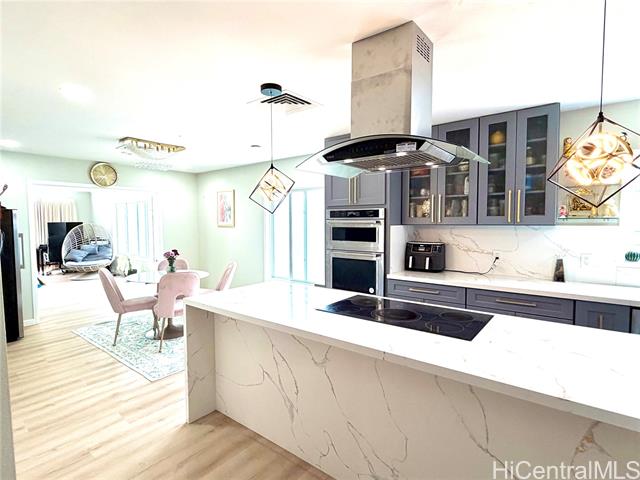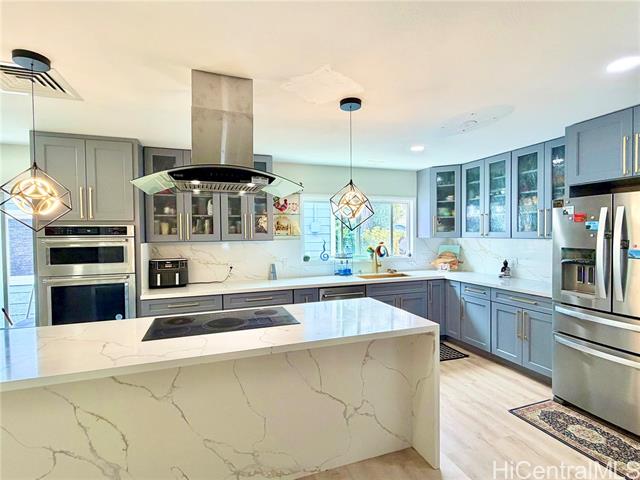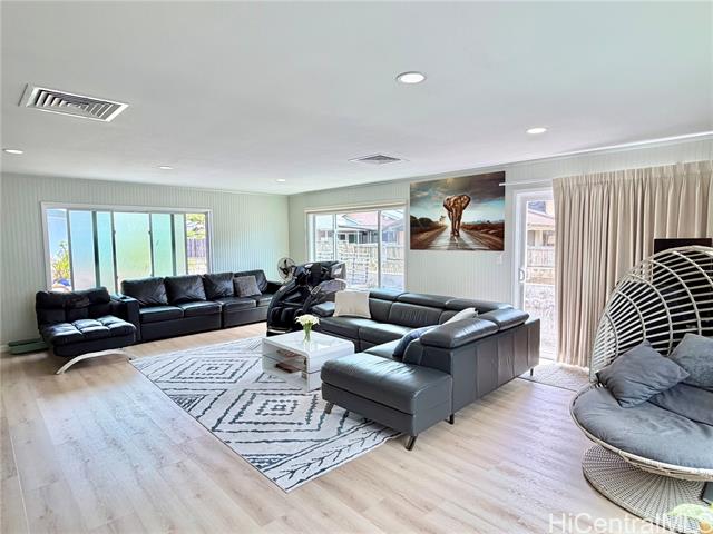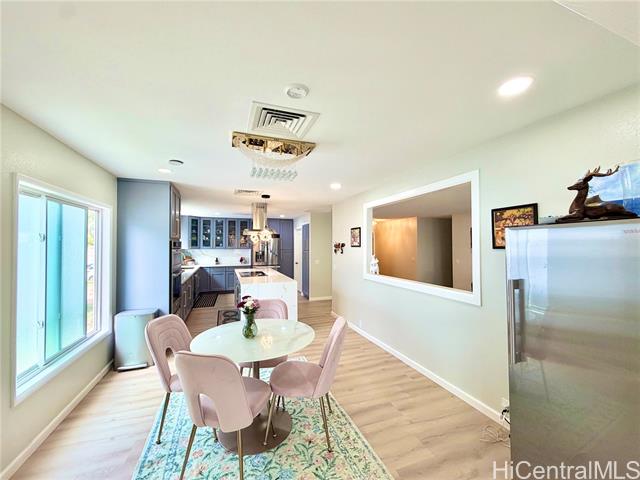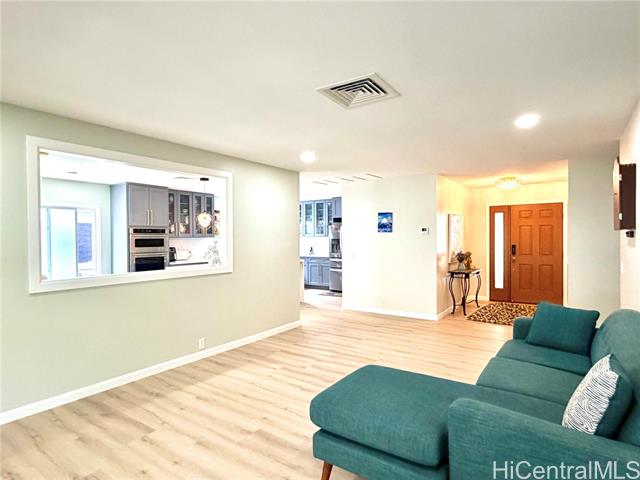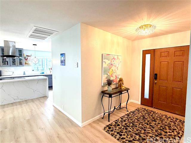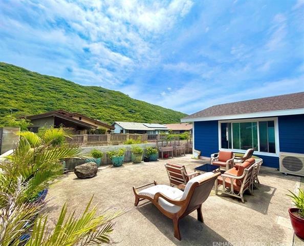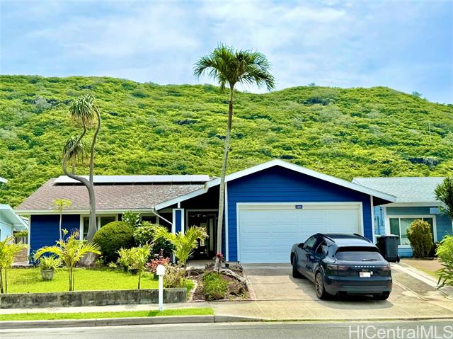 Nestled in Kalama Valley, one of the three valleys of Hawaii Kai, this beautifully renovated single-level home offers a tranquil, private setting just minutes from Sandy Beach. Positioned midway up the valley, enjoy level streets and a relaxed island lifestyle. Meticulously upgraded with a modern aesthetic, the home features spacious living, dining, and kitchen areas ideal for comfort and entertaining. Brand-new flooring, recessed lighting, and custom cabinetry elevate the interior, while the designer kitchen, highlighted by a striking gold sink blends style and function. Upgraded luxury vinyl flooring and fiberglass windows and sliding glass doors invite natural light and cool valley breezes. Both bathrooms are tastefully renovated with a soaking tub and walk-in shower. Energy efficient features include central A/C, a solar water heater, and 22 owned PV panels. An EV charging station and new HECO meter box add modern convenience. Do not walk the property without an appointment. Showings by appointment only. Note: Hawaii Kai has a sewer fee and association dues (-$105/year, please check with association).