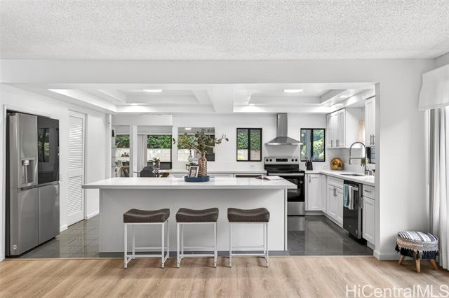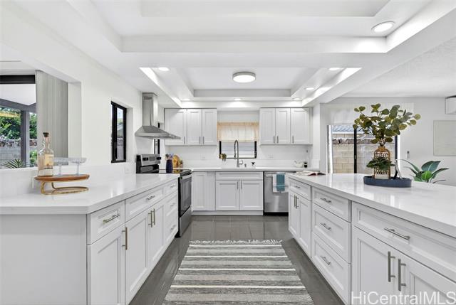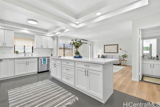 Rare opportunity in Kalama Valley! Beautifully renovated in 2026, this spacious 4-bed, 2.5-bath home offers 2,456 sf of interior living with an expansive first-floor layout and a fully permitted extension. The updated interior features new luxury vinyl plank flooring, quartz countertops, white shaker cabinets, fresh interior paint, and all new appliances—blending modern style with everyday functionality. Enjoy energy efficiency with 19 owned PV panels and the convenience of a 2-car garage plus ample driveway, boat, and street parking. Situated on a quiet street just one house separated from the neighborhood park, yet away from main road traffic, this home offers both comfort and location. With multiple living areas, a first-floor bedroom, and flexible space for entertaining or extended living, it’s well-suited for a variety of lifestyles. No HOA fees and VA financing welcome—experience the space, upgrades, and value of single-family living in one of East Honolulu’s most desirable communities.