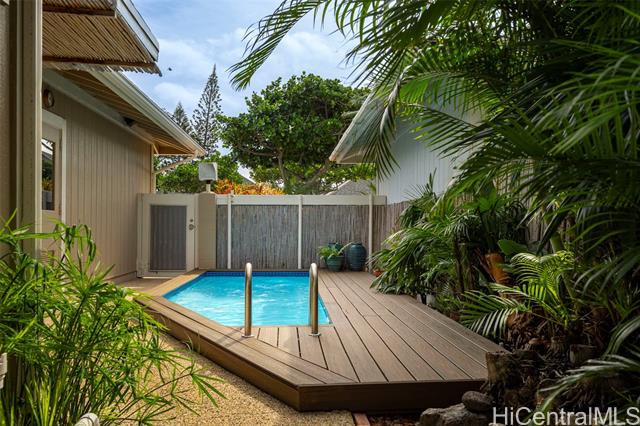 Discover island living at its finest in this lovely single-level, two-bedroom, two-bath home nestled in the golf-course community of Laulima. Thoughtfully designed with tasteful appointments throughout, this residence blends comfort, style, and an effortless indoor-outdoor lifestyle. Enjoy the inviting and open layout that flows seamlessly to the spacious lanai - perfect for morning coffee or alfresco dining. The home’s tropical ambiance is enhanced by lush landscaping and an above-ground pool complete with a brand-new deck, offering a retreat for relaxing or entertaining. Quality finishes and warm natural light create a serene atmosphere in every room, while the primary suite and guest bedroom provide peaceful, private spaces for everyday living. Located minutes from the fairways of the Hawaii Kai Golf Course and minutes from world-class beaches, hiking trails, shopping, dining, and all the conveniences of Hawaii Kai, this home offers the perfect balance of tranquility and accessibility. Whether you’re seeking a primary residence or a vacation-style retreat, this Laulima gem invites you to embrace the best of island living.