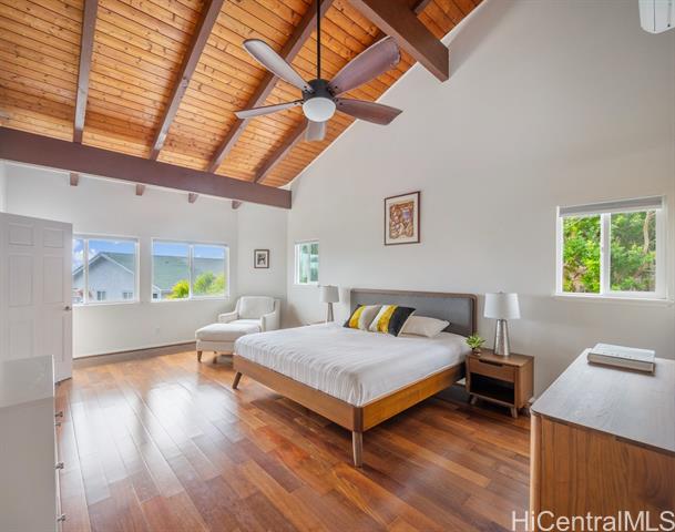 Contractor-built as a personal residence, this executive style 8-bedroom, 5-bath home reflects exceptional craftsmanship and intentional design throughout. Offering over 4,200 square feet of interior living space, expansive windows bathe the home in natural light while framing ocean and sunrise views. Cool trade winds, exposed beam ceilings, and a wraparound deck enhance the home’s indoor-outdoor lifestyle—perfect for both entertaining and everyday living. The flexible floor plan lends itself beautifully to multi-family living or potential rental opportunities with separate living quarters. Thoughtful features include a durable tile roof, split AC systems, a solar heated swimming pool, and garden. A generous three-car garage with ample storage adds everyday functionality. Recent upgrades—including remodeled bathrooms and garage, fresh exterior paint, and a newly tiled porch make this residence truly move-in ready. Thirty photovoltaic panels paired with a solar water heater contribute to energy efficiency and long-term savings, completing this well-maintained and thoughtfully improved home.