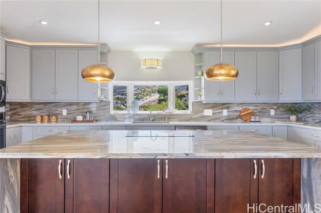 Enjoy breathtaking ocean and Diamond Head views from this stunning executive home which offers a blend of luxury, comfort, and privacy. Perfect for a multi-generational household or someone looking for a separate rental unit. The top floor features an open-concept layout with a large marble island, expansive walk-in pantry, and seamless flow to indoor/outdoor entertaining spaces. The middle level features 3 en suite bedrooms, a family room, and laundry room. The lower level, with separate entry, features 1 bed, 1 bath and is ideal for guests or ohana living. Steel framed construction. Relax by the private pool or unwind on multiple lanais while soaking in the views. Napali Haweo offers 24-hour security. Minutes to shopping, dining, and beaches. 3 car garage plus enough driveway space for a few more cars. An owned PV system features 32 panels ensures energy efficiency. A rare opportunity to own a tranquil island retreat in a prestigious setting.