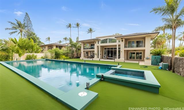Located in the prestigious Portlock neighborhood, this gated residence offers privacy and close proximity to Maunalua Bay, including ¼ shared ownership in a beach access walkway just steps from the property and convenience of nearby Hawaii Kai amenities, including Costco, grocery stores, dining, and shopping just minutes away. Designed by award-winning architect James McPeak, the home features soaring ceilings, expansive windows, Italian porcelain flooring, and generous interior living spaces. The layout includes five bedrooms with two primary suites, each with a private lanai, a bonus room, along with spa-inspired bathrooms and an in-home sauna. Set on a 13,000+ sq ft lot, the property is complemented by a 50-foot saltwater pool and spa, covered lanai, and outdoor bar area. Recent improvements include a new custom roof (2021), updated windows (2022, excluding select doors), and a solar system subject to a power purchase agreement.