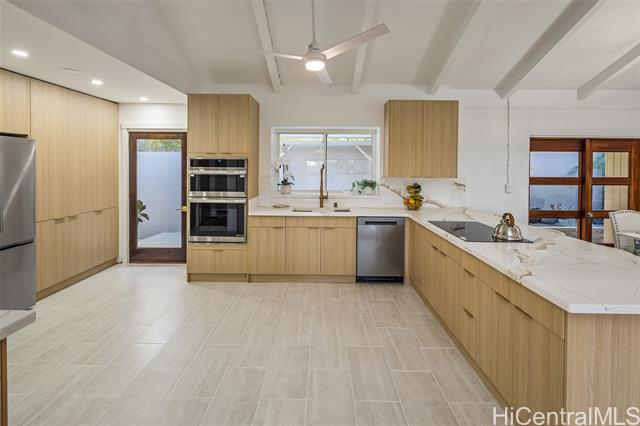 Spectacular panoramic ocean and mountain views greet you at this brand new renovated luxury residents located in the highly desirable Portlock, Koko Kai and Triangle neighborhood. This light filled island retreat showcases a wonderful single level four bedroom, four bath floorplan. The spacious living room also overlooks a stunning lap-worthy pool surrounded by tropical landscaping. The home is build with exceptional craftsmanship and is truly move in ready. Inside/outside living is perfect for family gatherings and entertainment. A very large and private primary suite offers a wonderful walk in closet and a spa inspired primary bathroom. The brand new gourmet kitchen features new high end LG appliances and offers ample space to create delightful meals. Three other bedrooms are located in the back of the house for utmost privacy and tranquility. The home comes with 25 owned PV panels and a Tesla battery, keeping energy costs very low. A two car garage offers lots of storage space. Upscale dining, shopping and world class snorkeling at Hanauma Bay can be reached within minutes. Plus sandy beaches and hiking trails are also part of this exceptional neighborhood.
