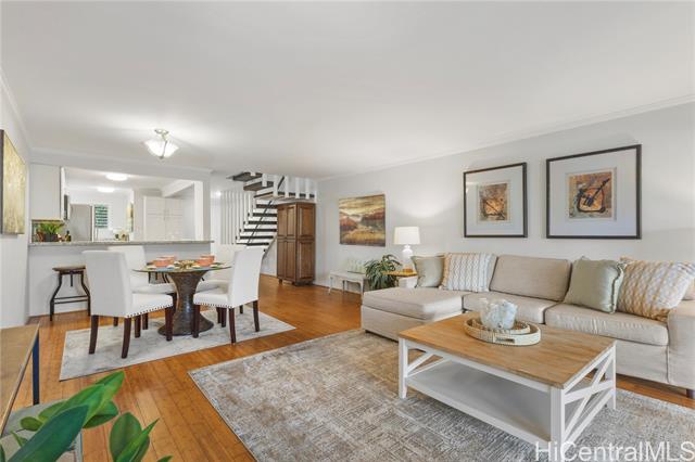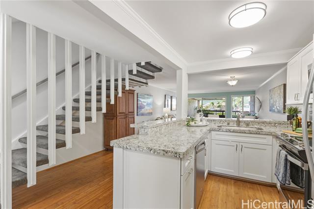 Embrace a relaxed “cottage on the marina” lifestyle in this inviting 3 bedroom, 2.5 bath townhome at Kaimala Marina. Cozy, updated open-concept kitchen welcomes you with quartz countertops, stainless steel appliances, and classic shaker-style cabinetry, designed for easy living and effortless entertaining. Bamboo flooring flows throughout, adds a coastal elegance. Spacious covered lanai extends your living space, perfect for morning coffee or unwinding as you take in the peaceful marina setting, rain or shine. Upstairs, the bedrooms offer flexibility with open closets you can tailor to your needs. The generous primary suite features its own private lanai for fresh air and quiet moments. Bathroom have also been updated and gives a clean, modern touch. Parking stalls conveniently located close to the unit, one of which is just outside your front door! Your storage unit, guest parking and a car wash are all in close proximity too. For boating enthusiasts, marina slips are available. A rare opportunity to enjoy island living with a charming waterfront that is comfortable, and quietly tucked into one of Hawaii Kai’s most desirable marina communities.