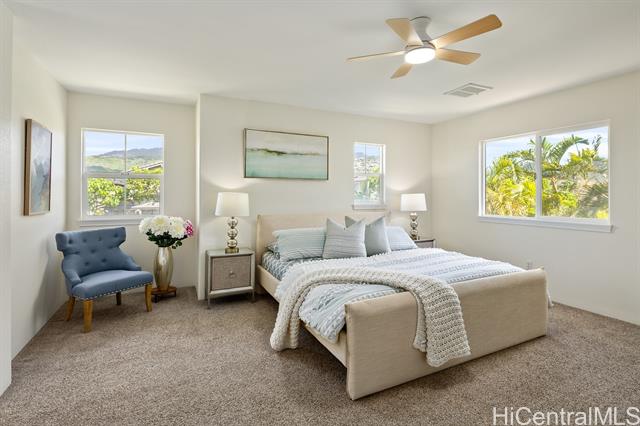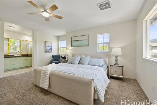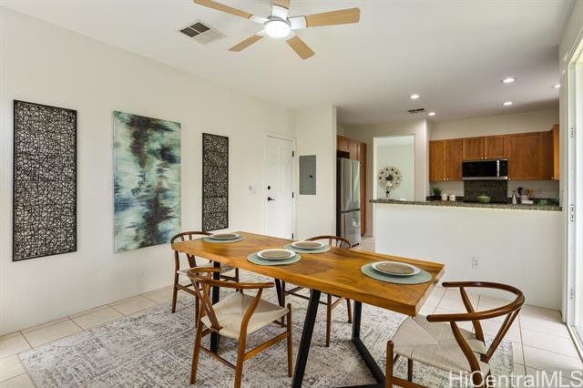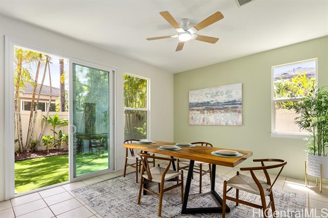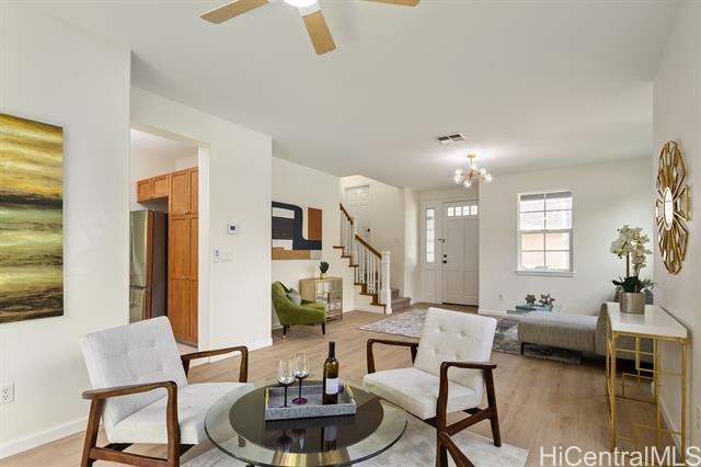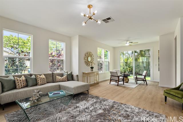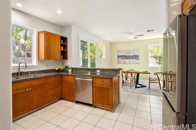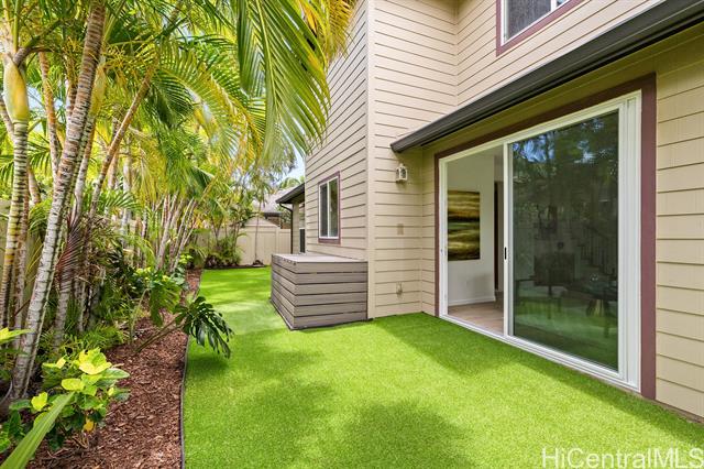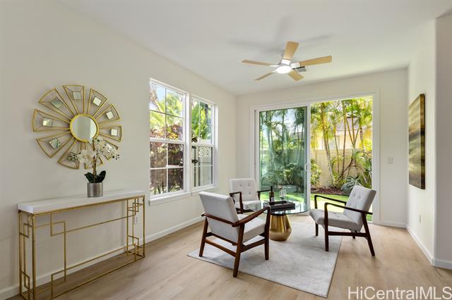 What a rare opportunity to own this highly sought-after detached/corner "Cottage" townhome in the prestigious gated community of The Peninsula at Hawaii. Only nine of the total 123 Cottages are detached. Enjoy Island living in this two-story home featuring high ceilings, plenty of natural light, an open floor plan that flows seamlessly from indoors to the private, landscaped backyard, and a two-car garage. Feel the sense of place and the tranquility in these beautiful tropical surroundings. 2026 renovations include new luxury vinyl plank flooring in the living room, new sliding doors and windows, new kitchen appliances, new plumbing fixtures, and refinished cabinets and countertops. All three bathrooms were also upgraded with new flooring, lighting, and plumbing fixtures. The two-zone central A/C system serves the upstairs and downstairs. One AC unit was replaced. The entire interior was also painted. The roof was replaced in mid-2025. It's move-in ready! Enjoy resort-style amenities including pools, spa, 24-hour gym, marina promenade, BBQ areas, parks, meeting facilities, and 24-hour security—perfect for active island living.