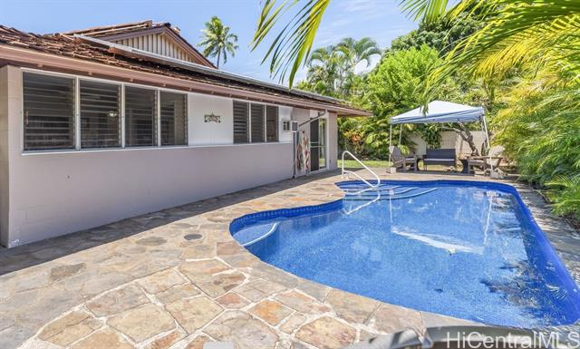 This could be just what you've been looking for! Ideal for two family living or great rental potential. The main house is 1,765 sq. ft. with 4 bedrooms and 2 full baths. In 2004 a large addition was added with 2 bedrooms, 1.5 baths and 1,266 sq. ft. of living area plus an upstairs deck lanai. This area can be opened to the main house or used as a separate living area. It even has its own laundry room. The Sellers had it rented for $3,050/month. The main house gives you a nice open floor plan with an addition off the dining area that can be a family room or home office space. There's also an extension off the primary bedroom that creates a primary suite that opens out to the pool. There are 38 owned PV Panels too. Located on the quiet end of Aikahi Loop with easy walking distance to Aikahi Shopping Center for dining and shopping. Kailua Beach is right around the corner. This one is a rare find! It's well worth coming by to take a look!