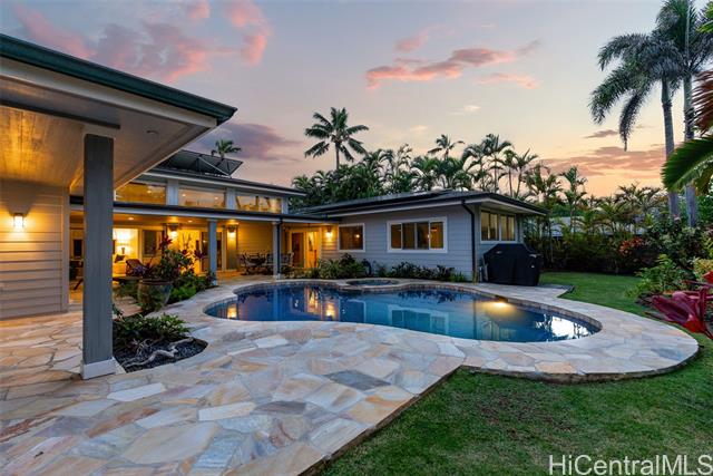 Experience the best of island living just a house away from the famed white sands of Kailua Beach. Perfectly located in a peaceful cul-de-sac within the coveted Beachside neighborhood, this single-level residence has 3 bedrooms, office/den, 2.5 baths on a generous 11,000 sqft lot. Private, gated beach access for this neighborhood reduces congestion and parking issues. This custom-built oasis features wide-open spaces with soaring 16-foot ceilings, travertine floors, oversized windows. Thoughtfully designed for indoor-outdoor living - ideal for entertaining or relaxing. Step outside to a private tropical sanctuary, where the sounds of ocean waves fill the air. Expansive covered lanai, pool and jacuzzi create an idyllic setting for outdoor dining or sunset cocktails. The pool's positioning provides separation between the home's two wings, while the elevated sundeck offers glimpses of the ocean. Luxurious primary suite features rich wood floors, dual walk-in closets and spa-like bathroom. Huge gourmet kitchen with expansive pantry. 46-panel owned PV system on net metering. Perfect location near shopping center and easy freeway access. Live your dream lifestyle today!
