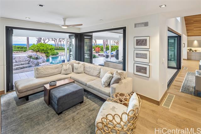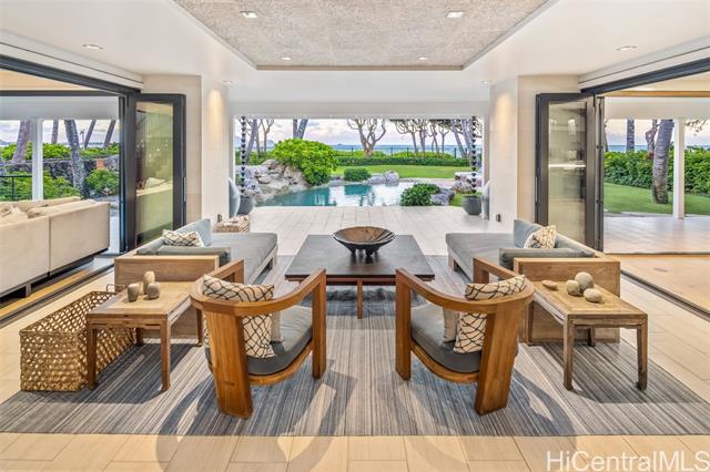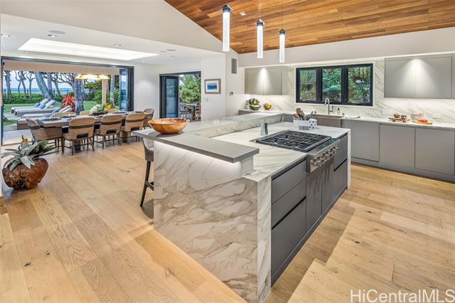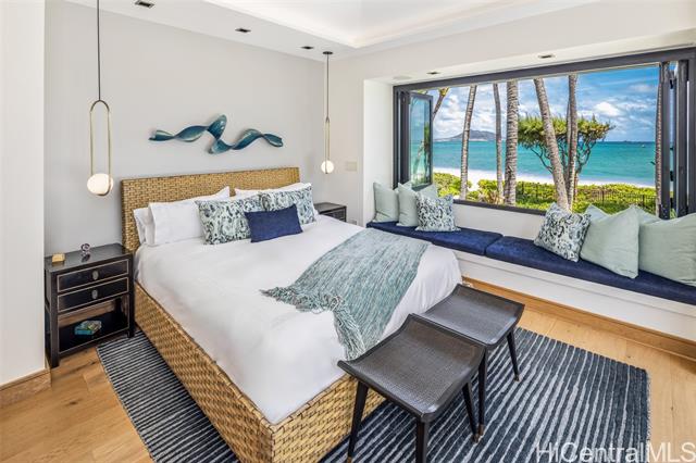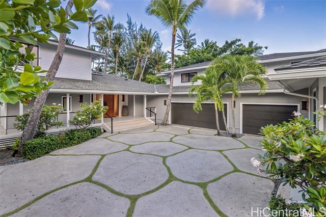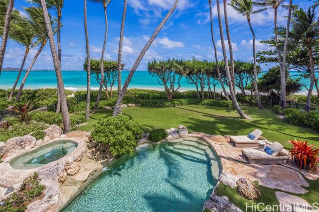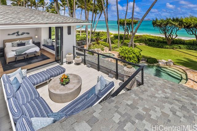 AMAZING NEW PRICE! Experience tranquil beachfront living in one of the most pristine areas along Kailua Beach, featuring stunning ocean views from the modern kitchen, spacious living room, and primary bedroom with a private oceanfront deck. Recent renovations include stylish baths that enhance the contemporary vibe. The custom kitchen flows into a welcoming dining area, ideal for gatherings and entertaining. A cozy cottage offers guest privacy, while ample parking and a three-car garage provide convenience. A dedicated office with courtyard access creates a peaceful workspace. Enjoy the lagoon pool and waterfall spa, with the beach just steps away for swimming, paddleboarding, or relaxing. Minutes from Kailua Beach Park, Mid-Pac Country Club, and Kailua Town, this home combines luxury and convenience. Your dream island lifestyle awaits!