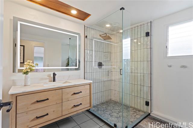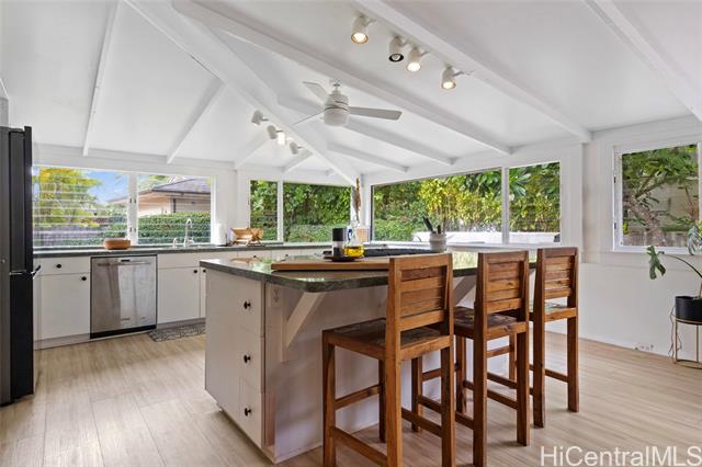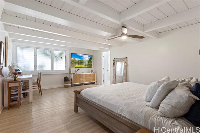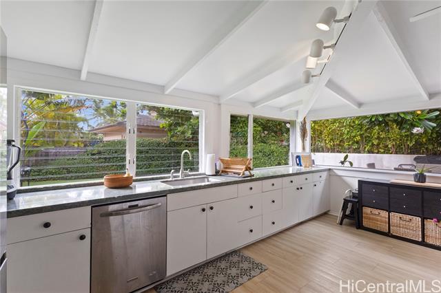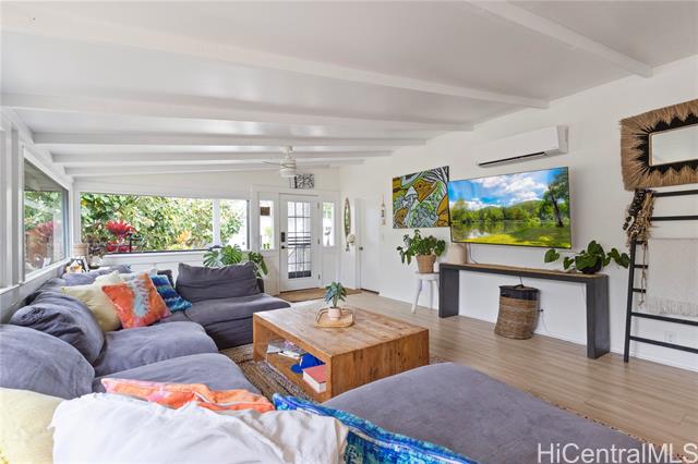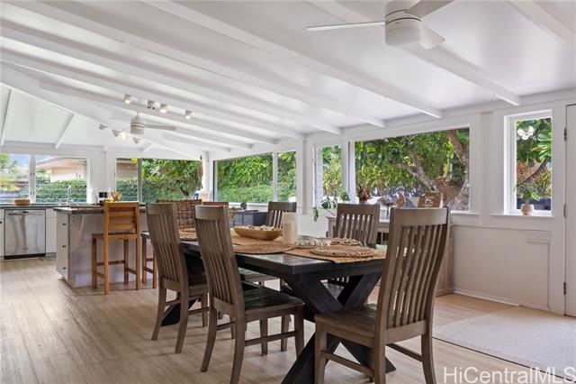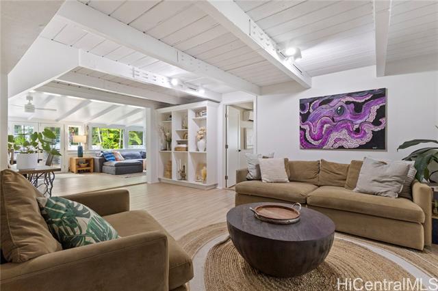 Welcome to your beachside paradise—just one lot from the ocean and directly next to the beach pathway on a quiet cul-de-sac. This lovingly maintained and upgraded 4-bedroom, 2-bath home offers 2,970 sq. ft. of living space on a 7,194 sq. ft. lot, blending comfort, space, and the ultimate island lifestyle. The open-concept design features a spacious great room, separate family room, and an expansive kitchen with island cooktop, granite countertops, gas stove, and double ovens—perfect for gathering with family and friends. A versatile loft adds flexible space for an office, media room, or guest retreat, with abundant storage throughout. Enjoy 918 sq. ft. Lanai that invites seamless indoor-outdoor living, overlooking a large backyard filled with lush tropical landscaping for a tranquil Hawaiian retreat. Rinse off after the beach in your outdoor shower, host with ease thanks to extra guest parking, and relax in comfort with Mitsubishi split A/C units and PV panels for energy efficiency. Moments from dining, shopping, and everyday conveniences—and seconds from your favorite beach activities—this is more than a home, it’s the Beachside Kailua Dream you’ve been waiting for.