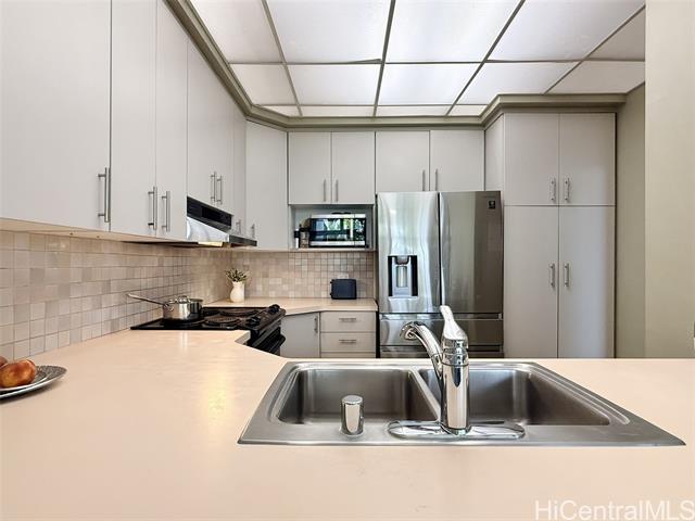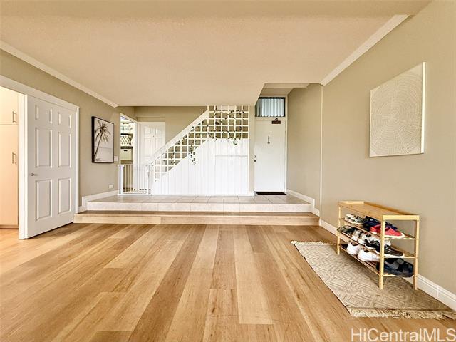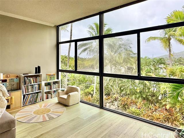 One of Kailua’s most tranquil resort-style communities, loved for its tropical landscaping, meandering koi ponds, and peaceful garden ambiance. This beautiful, well situated home offers generous space, privacy, and options for indoor-outdoor living. Welcome home to a dramatic wall of windows anchoring the main living area overlooking serene koi ponds, swaying palms, and greenery. High ceilings enhance the light-filled, treehouse-like retreat cooled by gentle tradewinds, with breathtaking floor-to-ceiling mountain views from the private lanai, kitchen, living room, and rooftop terrace. The open-concept layout is ideal for everyday living and entertaining. The primary suite downstairs boasts a large walk-in closet and ensuite bath, two bedrooms plus full bath upstairs. Ample closets and storage throughout. The rooftop lanai is perfect for relaxing or hosting against the backdrop of mountain vistas. Two covered parking stalls. Easy path to parking and Windward Harbour's exceptional amenities, pool, spa, sauna, tennis courts, BBQ areas, and rec room. Secured entry. All just minutes from famous Kailua beaches, shopping, dining, and outdoor adventures—this is island living at its best.