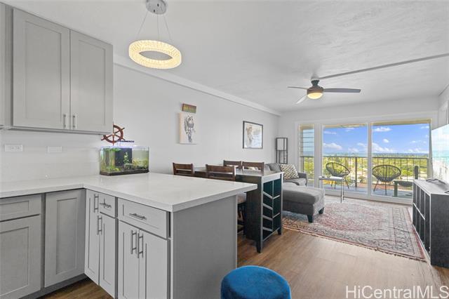 Stunningly updated high-floor corner unit at Meridian East, offering sweeping views of Kailua Bay from an expansive lanai. This 2-bedroom home boasts modern finishes, including quartz countertops, rich hardwood cabinetry, updated appliances, and luxury vinyl and ceramic tile flooring throughout. The open-concept living space extends seamlessly to the lanai, where you can enjoy the sights of Kailua town with the ocean as your backdrop. New vinyl windows and ceiling fans enhance airflow and natural light. The kitchen features bar seating andopens up to the main living area—perfect for entertaining. Enjoy relaxing by the pool or take a quick trip to the world-renowned Kailua Beach. Includes one covered parking space in a secure, pet-friendly building surrounded by popular shops and dining options. Take advantage of a VA assumable loan at just 2.5%! An incredible opportunity in today’s market.