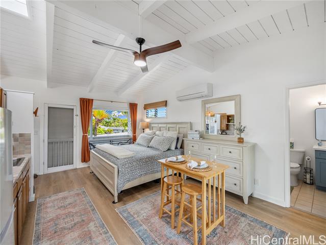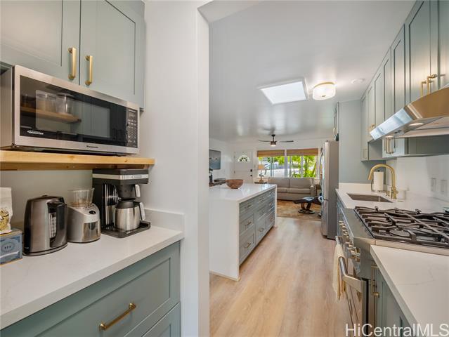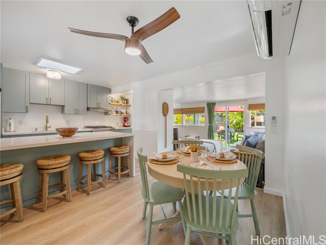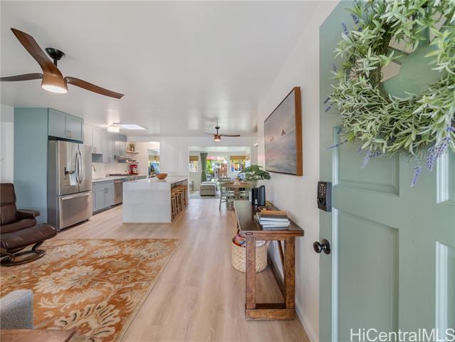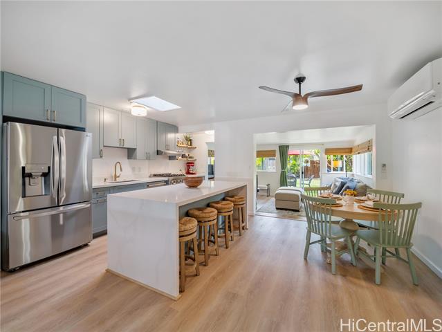 The scent of plumeria greets you up the path to the entry of this charming and intimate hideaway. Intended as a forever home, lots of love went into upgrading this hidden gem in the coveted Kalama Tract area, very close to the Kai One tree lined right of way that leads to an endless stretch of white sand beach + azure blue water. The Kitchen is fully remodeled + opened to the living + dining areas, creating a great room, with new cupboards, appliances + fabulous island + counters all covered with classic white quartz + flows into a bright sun room + beyond to the large private tree lined yard. A flexible floor plan allows for multigenerational living with ocean breezes + mountain serenity on the upper covered lanai + an extra fully enclosed sitting/office area with separate stairway from outside as well as an inner stairway connecting both levels. Upstairs suite has it?s own fridge + a full bank of cupboards for morning coffee in bed or on the lanai. The extended carport can easily double as parking spot + a wonderful storage area + still boasts a separate laundry room with new stainless front loading washer/dryer, a drink fridge + room for more storage! As dreamy as it sounds..