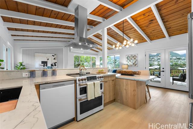 Enjoy this beautiful home perched a little higher up in Keolu Hills with beautiful Olomana and Koolau mountain views. Conveniently located near Enchanted Lake Shopping Center, Kailua Town and the beaches, this home is complete with warm and modern finishes. This 3-bedroom, 2-bathroom home has been completely remodeled and is ready for you to create a lot of new memories, enjoy gatherings and more! As you walk through the entrance of the home, you’ll be greeted by lots of windows throughout offering you lots of sunlight, vaulted ceilings, an open kitchen with a Bosch dishwasher and Café Brand appliances. The yard may be down slope but there is still a very good sized out door space with a covered pergola perfect for watching the sunsets and enjoying island living. There is also a separate laundry room off the kitchen and a new roof.