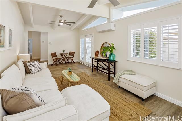 Rare opportunity to own 1355 and 1355A Manu Mele St, a 2-unit CPR on a 9,600 sq ft parcel in desirable Kailua. Live in one, rent the other, or perfect for multigenerational living! Adjacent to Adventist Health Castle and the YMCA with easy access to the highways, this attached duplex-style property consists of two single-level 3-bedroom units, each with its own back yard. This property has been meticulously cared for by the same owner since the CPR was created in 2004. Each bedroom and living area has a split AC. The first unit (1355) offers 1,266 of interior space including a detached office, also with split AC, up the hill. The 6,105 sq ft lot has a generous private garden with fish pond and patio for entertaining. The open kitchen boasts stainless-steel appliances and a gas stove with the gas piped in from the street – a rarity! There are 19 owned photovoltaic panels with net metering on this side. The roof was replaced in 2025 and comes w/ a warranty. A side path leads to 1355A, bright & airy with 12-ft ceilings, plantation shutters and split ACs. This separately metered unit was renovated in 2025 and is move-in ready. Skip Kailua Town traffic & shave minutes off your commute!