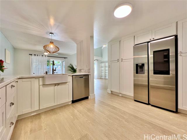 Wow- this price! Enchanted Lake's beloved 10 acre lakeside community, Kukilakila. Now vacant, move-in ready! Beautifully remodeled home (2021) with 2 car garage, 3 lanais, fenced yard, pet friendly community. Open and airy design, wood cabs, marble counters and backsplash, stainless steel appliances, three pantry cabinets. Kitchen and dining area flow seamlessly to a private covered lanai. 5 split ACs, ceiling fans throughout, plus breezes! Primary BR has lanai w/ lake and sunrise view. Permitted addition is XL bedroom; works well as 3 BR+ air conditioned office. Low monthly fee covers a lot, incl exterior (roof, siding, lanais, fences), foundation, and resort-like landscaping and amenities, heated pool, rec area, gym, boat storage, boat ramp & more. Home has 2 car driveway; extra guest and street parking nearby. Blue ribbon elem school nearby. Green space abound, and the lake leads through canal waterways to Kailua Beach. Imagine living by the lake, dramatic mountain views, relaxing on benches, strolling the paths, or taking your kayak/SUP to the beach! By street, only 5 mins to world famous beach or Kailua Town for dining, shopping, etc. Owner found replacement property!