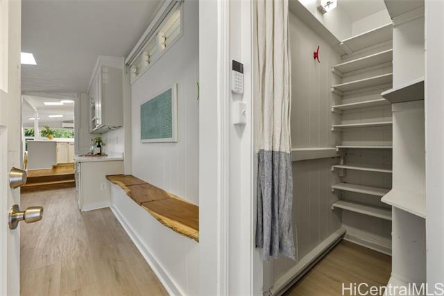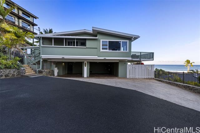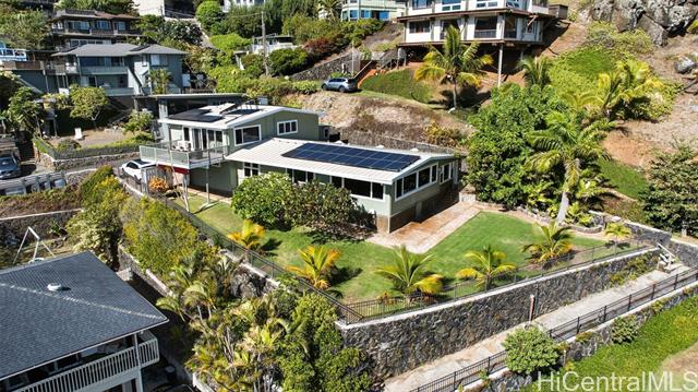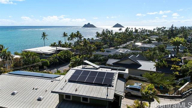 Exceptional Lanikai opportunity. Positioned just above the Lanikai entry, this elevated home enjoys sweeping ocean and Mokulua Islands views while remaining an easy stroll to the beach. The setting is private and lush, with terraced lava rock walls, tropical landscaping, and a flat back lawn perfect for entertaining or relaxing. FEMA flood zone X. This classic two-story Hawaiian beach home has been beautifully refreshed with a new kitchen, new flooring, new fixtures including two Toto bidet toilets, and split A/C in every room. Energy efficiency and comfort are built in with 32 owned solar panels, 3 Tesla Powerwall batteries, EV charger, new hot water heater, and new electrical panel. Additional highlights include new Lutron lighting throughout, a new second-floor deck with ocean views, upgraded windows, new plumbing, a Wi-Fi sprinkler system, and a security alarm. Actual square footage differs from tax records. Inquire about the pending opportunity to acquire adjacent City of Honolulu roadway parcels that could significantly expand the land area. Showings by appointment only