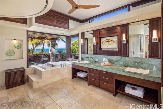 PUUHONUA - An oceanfront sandy beach sanctuary on the most desired spot of world renowned Lanikai Beach. The expansive oceanside lawn ensures peace, tranquility, and the utmost privacy on the envious half acre of land. The home is a celebration of luxurious island living, and features an ultra-spacious primary suite with its own private ocean view lanai. All bedrooms are ensuite. The beautifully appointed open kitchen is the central place for family and friends to gather, and features only the best in appliances and appointments. Outdoor dining after a relaxing day at the beach, or sunning by the courtyard pool – This legacy property is a Great Escape to Wonderful, and an opportunity to embrace the very special spirit and sense of community that is Lanikai. Calm, translucent, turquoise waters, glistening white sand beach, and its own premier golf course just steps away.