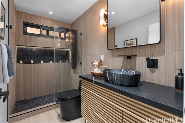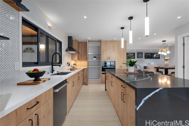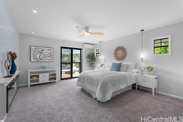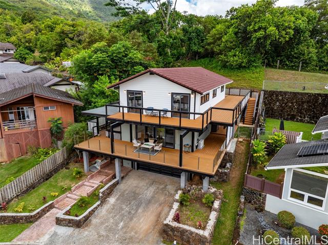 Located in the highly desirable neighborhood of Maunawili, this beautifully remodeled home sits under the breathtaking and serene mountains while the location provides a peaceful and relaxing environment. This home offers an enclosed garage and two levels of living space with wrap around decks on each floor (approx. 570 sf on the second level and almost 1000 sf on the top level), perfect for entertaining family and friends. You will love the attention to details throughout. The main floor boasts an open concept design with a large open kitchen with Cafe Brand appliances, a walk-in pantry, full bathroom and a bright, spacious living room perfect for entertainment and enjoying the views. The upper floor offers 4 bedrooms and 2 bathrooms. The primary bedroom is designed with a walk-in closet, spa like bathroom with a soaking tub and separate shower, a wall mounted electric fire place, and a wine refrigerator. Come home and appreciate the jacuzzi and BBQ grill that is included on the deck. Maunawili is just a short distance away from Pali Hwy, H-3, Downtown, shopping centers and to the beaches.