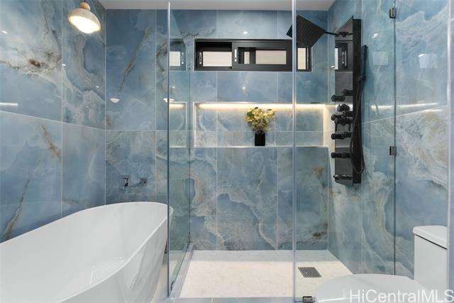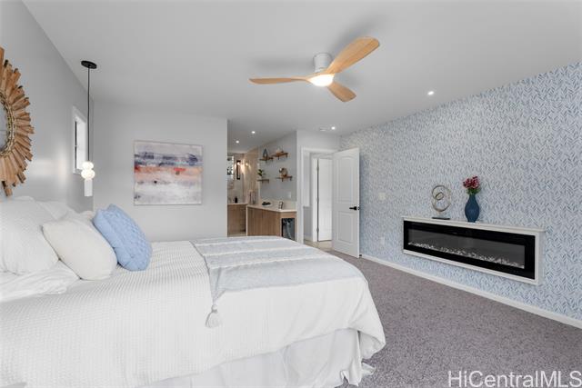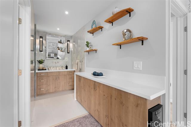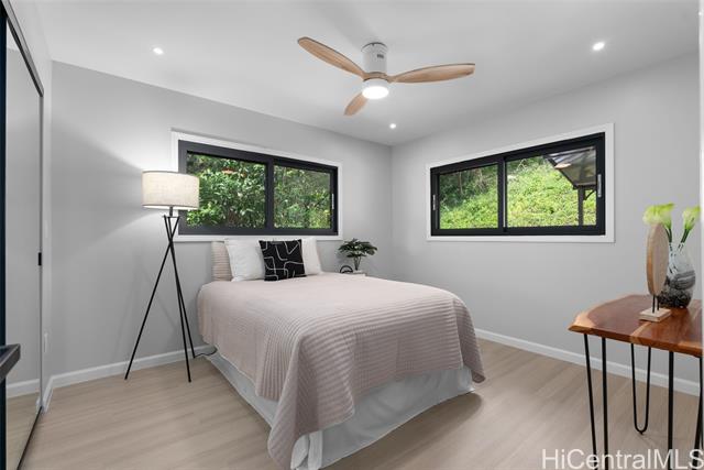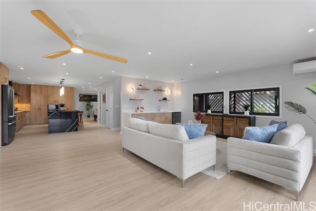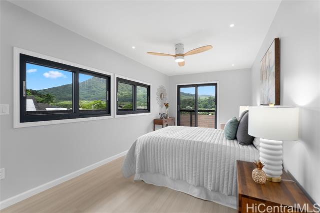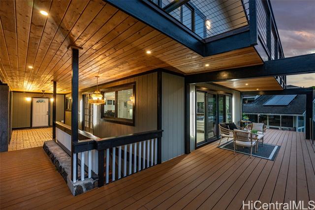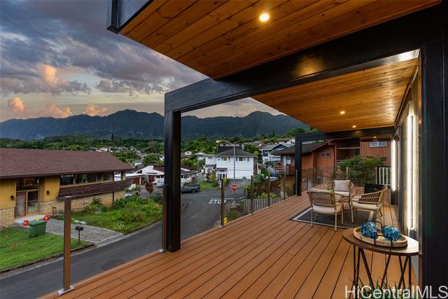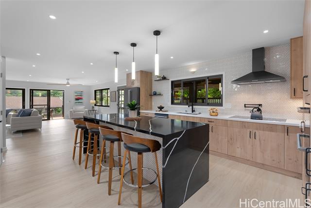 Located in the highly desirable neighborhood of Maunawili, this beautifully remodeled home sits under the breathtaking and serene mountains while the location provides a peaceful and relaxing environment. This home offers an enclosed garage and two levels of living space with wrap around decks on each floor (approx. 570 sf on the second level and almost 1000 sf on the top level), perfect for entertaining family and friends. You will love the attention to details throughout. The main floor boasts an open concept design with a large open kitchen with Cafe Brand appliances, a walk-in pantry, full bathroom and a bright, spacious living room perfect for entertainment and enjoying the views. The upper floor offers 4 bedrooms and 2 bathrooms. The primary bedroom is designed with a walk-in closet, spa like bathroom with a soaking tub and separate shower, a wall mounted electric fire place, and a wine refrigerator. Come home and appreciate the jacuzzi and BBQ grill that is included on the deck. Maunawili is just a short distance away from Pali Hwy, H-3, Downtown, shopping centers and to the beaches.
