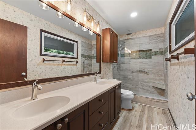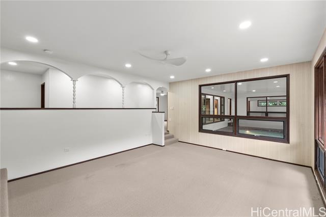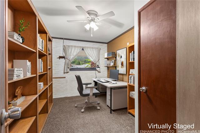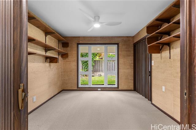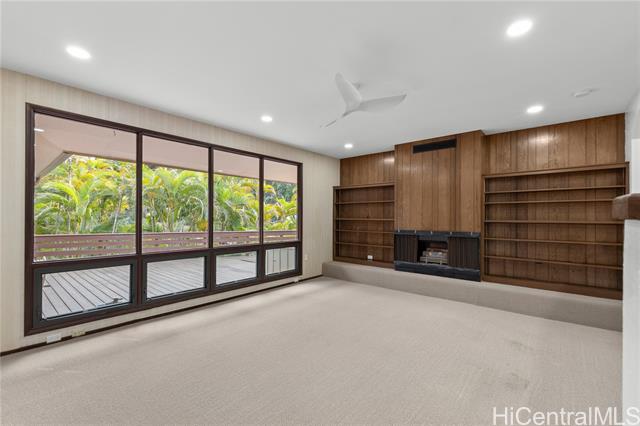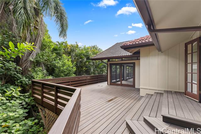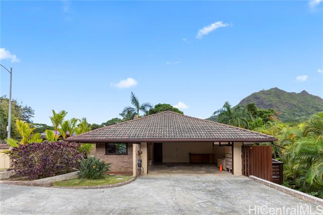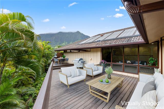 Discover a rare opportunity in the quiet Maunawili community, tucked against the majestic Ko'olau mountain range. This 3-bedroom, 2-bath home, with a bonus den, sits on an oversized 12,090 sq. ft. lot at the end of a cul-de-sac and features one of its most unique highlights—an indoor heated swimming pool in a screened-in lanai. Large windows and sliding doors open to an expansive wraparound deck overlooking lush tropical foliage, creating a peaceful, treehouse-like setting. The fenced outdoor space includes a small grassy area and mature plantings, while the elevated deck offers a private perch among the trees. Inside, natural light filters through the home, adding warmth to the living spaces. A pull-down ladder in the garage leads to a spacious attic, providing an uncommon amount of storage for a Hawai‘i property. The residence also includes a two-car carport, additional driveway parking, ample attic space and rooftop solar panels dedicated to heating the pool. Located just minutes from Kailua Town, beaches, schools, and freeway access, this Maunawili retreat blends privacy, space, and possibility in one of Windward O‘ahu’s most serene neighborhoods.