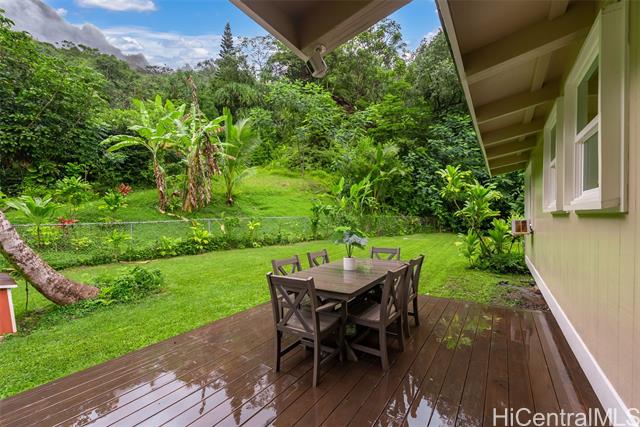 This cozy home is situated at the entrance of over 8 acres of lush greenery, offering a truly tranquil escape from city life. While reaching the upper portion of the property is a hike, it rewards you with absolutely spectacular views. The level area of the lot features a spacious enclosed yard and a separate, thriving vegetable and herb garden. Inside, the home boasts a bright, open-concept floor plan with high vaulted ceilings. The numerous picture windows are perfectly positioned to capture the surrounding garden and majestic mountain views. The kitchen and laundry room feature newer appliances. Additionally, modern bathrooms and air conditioning makes for a comfortable and contemporary living experience. The large deck, approximately 360 square feet, provides ample space for outdoor entertaining and enjoying the clear night skies for stargazing. The convenience of this location—offering true island living with streams, hiking and beaches nearby while remaining accessible to Oahu’s major resources, including the main trauma center, Financial District, Military installations, and abundant dining and shopping—makes this a truly unique opportunity.